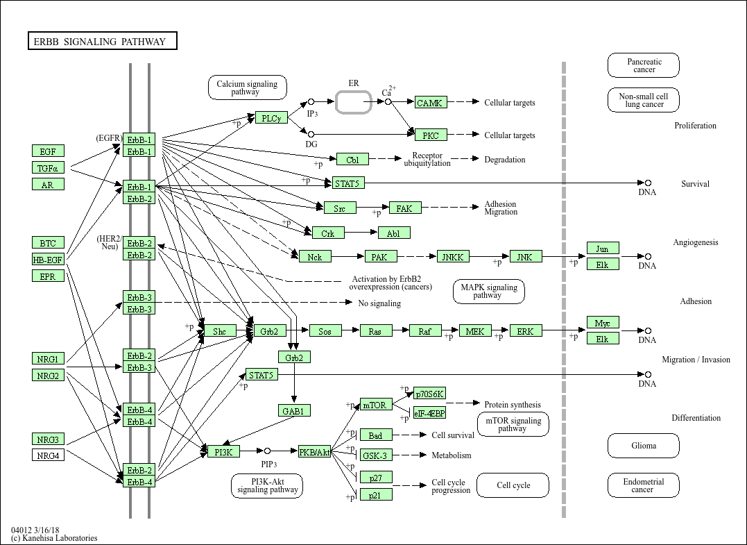 The ErbB family of receptor tyrosine kinases (RTKs) couples binding of extracellular growth factor ligands to intracellular signaling pathways regulating diverse biologic responses, including proliferation, differentiation, cell motility, and survival. Ligand binding to the four closely related members of this RTK family -epidermal growth factor receptor (EGFR, also known as ErbB-1 or HER1), ErbB-2 (HER2), ErbB-3 (HER3), and ErbB-4 (HER4)-induces the formation of receptor homo- and heterodimers and the activation of the intrinsic kinase domain, resulting in phosphorylation on specific tyrosine residues (pY) within the cytoplasmic tail. Signaling effectors containing binding pockets for pY-containing peptides are recruited to activated receptors and induce the various signaling pathways. The Shc- and/or Grb2-activated mitogen-activated protein kinase (MAPK) pathway is a common target downstream of all ErbB receptors. Similarly, the phosphatidylinositol-3-kinase (PI-3K) pathway is directly or indirectly activated by most ErbBs. Several cytoplasmic docking proteins appear to be recruited by specific ErbB receptors and less exploited by others. These include the adaptors Crk, Nck, the phospholipase C gamma (PLCgamma), the intracellular tyrosine kinase Src, or the Cbl E3 ubiquitin protein ligase.