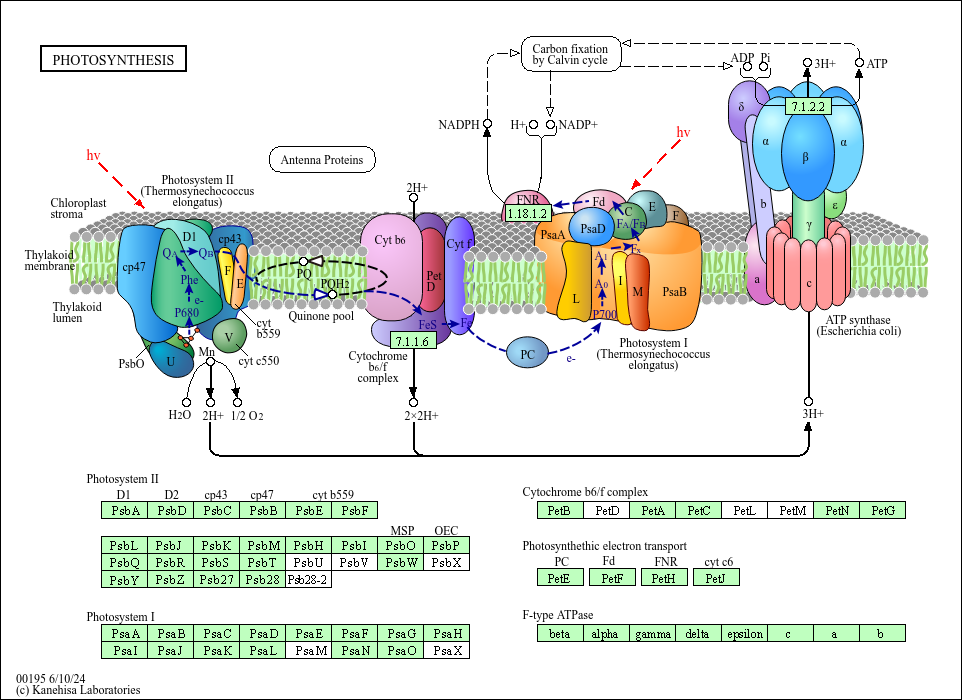 Photosynthesis in green plants and specialized bacteria is the process of utilizing light energy to synthesize organic compounds from carbon dioxide and water. It consists of the light dependent part (light reaction) and the light independent part (dark reaction, carbon fixation). The light reaction takes place in thylakoid, a membrane-bound compartment inside chloroplasts and cyanobacteria. The light energy is used by photosystems I and II to generate proton motive force and reducing power (NADPH or NADH). The proton motive force is used by ATP synthase to generate ATP, essentially in the same way as the mitochondrial respiratory chain. The supplies of ATP and NAD(P)H are then used to fix carbon dioxide.