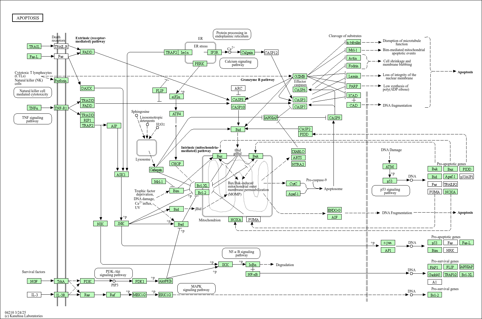 Apoptosis is a genetically programmed process for the elimination of damaged or redundant cells by activation of caspases (aspartate-specific cysteine proteases). The onset of apoptosis is controlled by numerous interrelating processes. The 'extrinsic' pathway involves stimulation of members of the tumor necrosis factor (TNF) receptor subfamily, such as TNFRI, CD95/Fas or TRAILR (death receptors), located at the cell surface, by their specific ligands, such as TNF-alpha, FasL or TRAIL, respectively. The 'intrinsic' pathway is activated mainly by non-receptor stimuli, such as DNA damage, ER stress, metabolic stress, UV radiation or growth-factor deprivation. The central event in the 'intrinsic' pathway is the mitochondrial outer membrane permeabilization (MOMP), which leads to the release of cytochrome c. These two pathways converge at the level of effector caspases, such as caspase-3 and caspase-7. The third major pathway is initiated by the constituents of cytotoxic granules (e.g. Perforin and Granzyme B) that are released by CTLs (cytotoxic T-cells) and NK (natural killer) cells. Granzyme B, similarly to the caspases, cleaves its substrates after aspartic acid residues, suggesting that this protease has the ability to activate members of the caspase family directly. It is the balance between the pro-apoptotic and anti-apoptotic signals that eventually determines whether cells will undergo apoptosis, survive or proliferate. TNF family of ligands activates anti-apoptotic or cell-survival signals as well as apoptotic signals. NGF and Interleukin-3 promotes the survival, proliferation and differentiation of neurons or hematopoietic cells, respectively. Withdrawal of these growth factors leads to cell death, as described above.