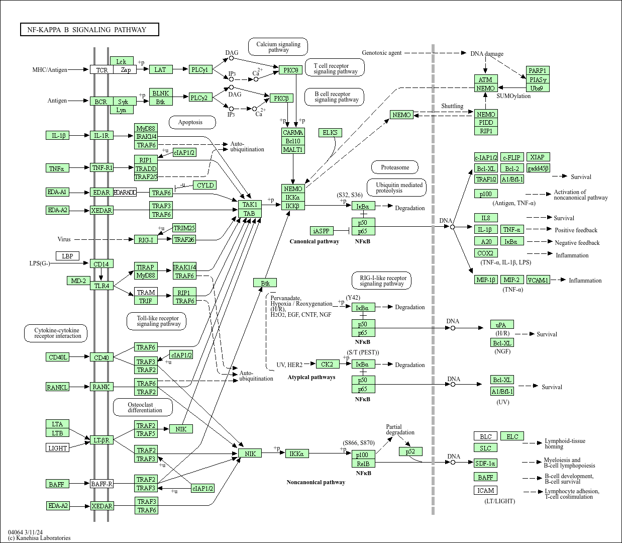 Nuclear factor-kappa B (NF-kappa B) is the generic name of a family of transcription factors that function as dimers and regulate genes involved in immunity, inflammation and cell survival. There are several pathways leading to NF-kappa B-activation. The canonical pathway is induced by tumour necrosis factor-alpha (TNF-alpha), interleukin-1 (IL-1) or byproducts of bacterial and viral infections. This pathway relies on IKK- mediated IkappaB-alpha phosphorylation on Ser32 and 36, leading to its degradation, which allows the p50/p65 NF-kappa B dimer to enter the nucleus and activate gene transcription. Atypical pathways are IKK-independent and rely on phosphorylation of IkappaB-alpha on Tyr42 or on Ser residues in IkappaB-alpha PEST domain. The non-canonical pathway is triggered by particular members of the TNFR superfamily, such as lymphotoxin-beta (LT-beta) or BAFF. It involves NIK and IKK-alpha-mediated p100 phosphorylation and processing to p52, resulting in nuclear translocation of p52/RelB heterodimers.