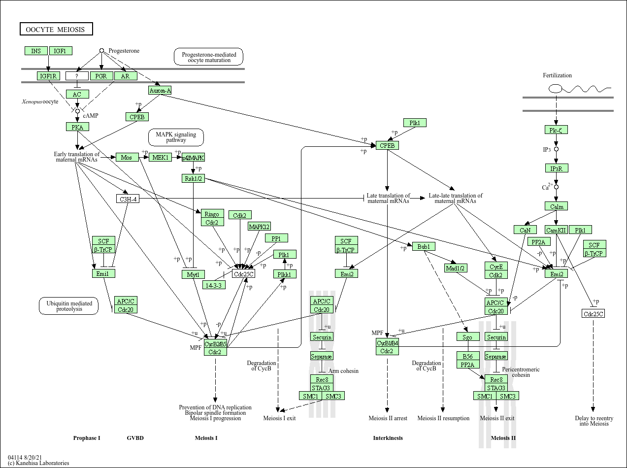 During meiosis, a single round of DNA replication is followed by two rounds of chromosome segregation, called meiosis I and meiosis II. At meiosis I, homologous chromosomes recombine and then segregate to opposite poles, while the sister chromatids segregate from each other at meoisis II. In vertebrates, immature oocytes are arrested at the PI (prophase of meiosis I). The resumption of meiosis is stimulated by progesterone, which carries the oocyte through two consecutive M-phases (MI and MII) to a second arrest at MII. The key activity driving meiotic progression is the MPF (maturation-promoting factor), a heterodimer of CDC2 (cell division cycle 2 kinase) and cyclin B. In PI-arrested oocytes, MPF is initially inactive and is activated by the dual-specificity CDC25C phosphatase as the result of new synthesis of Mos induced by progesterone. MPF activation mediates the transition from the PI arrest to MI. The subsequent decrease in MPF levels, required to exit from MI into interkinesis, is induced by a negative feedback loop, where CDC2 brings about the activation of the APC (anaphase-promoting complex), which mediates destruction of cyclin B. Re-activation of MPF for MII requires re-accumulation of high levels of cyclin B as well as the inactivation of the APC by newly synthesized Emi2 and other components of the CSF (cytostatic factor), such as cyclin E or high levels of Mos. CSF antagonizes the ubiquitin ligase activity of the APC, preventing cyclin B destruction and meiotic exit until fertilization occurs. Fertilization triggers a transient increase in cytosolic free Ca2+, which leads to CSF inactivation and cyclin B destruction through the APC. Then eggs are released from MII into the first embryonic cell cycle.