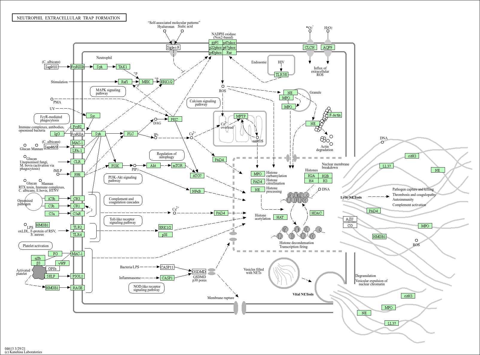 Neutrophils play a central role in innate immune defense. One of the mechanisms of neutrophil action is the formation of neutrophil extracellular traps (NETs), the extracellular structures composed of chromatin coated with histones, proteases and granular and cytosolic proteins that help catch and kill microorganisms. NETs are formed by a process known as "NETosis" that can be triggered by microorganisms and endogenous stimuli, such as damage-associated molecular patterns and immune complexes, and involves activation in most cases of nicotinamide adenine dinucleotide phosphate (NADPH)-oxidase, which produces reactive oxygen species (ROS). Recent study has reported that there are two different mechanisms of NETosis, including a lytic NETosis and a vital NETosis. Lytic NETosis begins with nuclear delobulation and the disassembly of the nuclear envelope and continues with loss of cellular polarization, chromatin decondensation and plasma membrane rupture. Vital NETosis can occur independently of cell death and involves the secreted expulsion of nuclear chromatin that is accompanied by the release of granule proteins through degranulation.