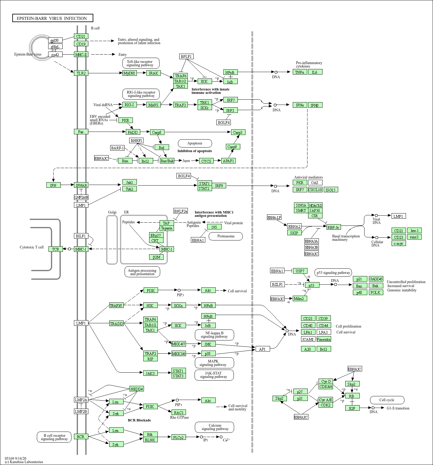 Epstein-Barr virus (EBV) is a gamma-herpes virus that widely infects human populations predominantly at an early age but remains mostly asymptomatic. EBV has been linked to a wide spectrum of human malignancies, including nasopharyngeal carcinoma and other hematologic cancers, like Hodgkin's lymphoma, Burkitt's lymphoma (BL), B-cell immunoblastic lymphoma in HIV patients, and posttransplant-associated lymphoproliferative diseases. EBV has the unique ability to establish life-long latent infection in primary human B lymphocytes. During latent infection, EBV expresses a small subset of genes, including 6 nuclear antigens (EBNA-1, -2, -3A, -3B, -3C, and -LP), 3 latent membrane proteins (LMP-1, -2A, and -2B), 2 small noncoding RNAs (EBER-1 and 2). On the basis of these latent gene expression, three different latency patterns associated with the types of cancers are recognized.