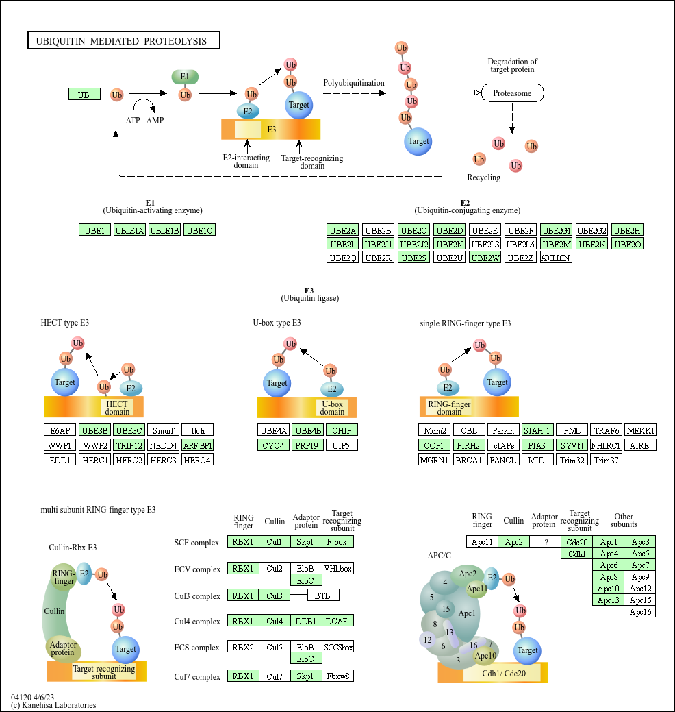 Protein ubiquitination plays an important role in eukaryotic cellular processes. It mainly functions as a signal for 26S proteasome dependent protein degradation. The addition of ubiquitin to proteins being degraded is performed by a reaction cascade consisting of three enzymes, named E1 (ubiquitin activating enzyme), E2 (ubiquitin conjugating enzyme), and E3 (ubiquitin ligase). Each E3 has specificity to its substrate, or proteins to be targeted by ubiquitination. Many E3s are discovered in eukaryotes and they are classified into four types: HECT type, U-box type, single RING-finger type, and multi-subunit RING-finger type. Multi-subunit RING-finger E3s are exemplified by cullin-Rbx E3s and APC/C. They consist of a RING-finger-containing subunit (RBX1 or RBX2) that functions to bind E2s, a scaffold-like cullin molecule, adaptor proteins, and a target recognizing subunit that binds substrates.
