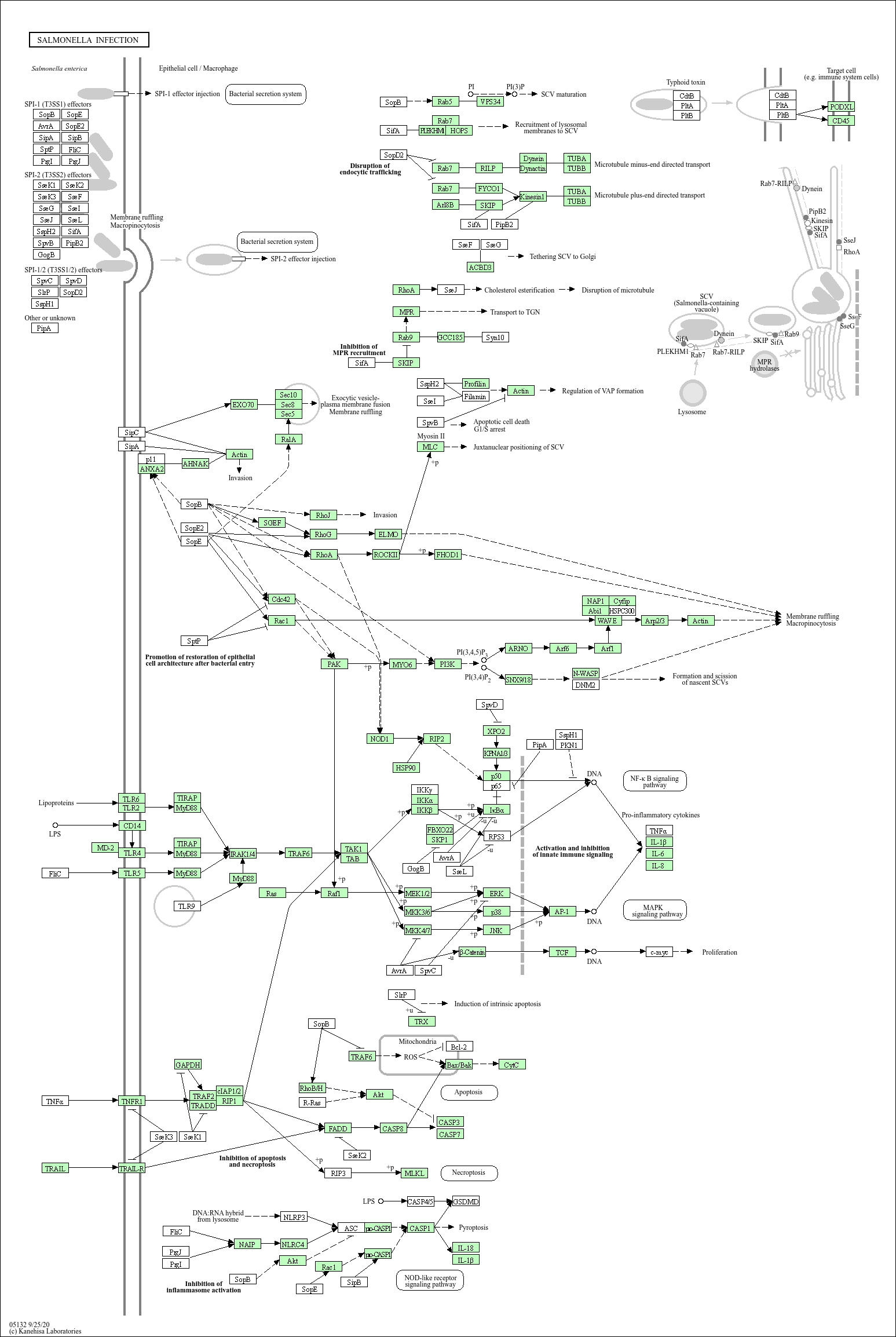 Following intestinal colonization Salmonella inject effector proteins into the host cells using a type III secretion system (T3SS), T3SS1. Then a small group of effector proteins induce rearrangement of the actin cytoskeleton resulting in membrane ruffles and rapid internalization of the bacteria.The T3SS2 is responsible for translocating effector proteins that direct Salmonella-containing vacuole (SCV) maturation. The majority of the bacteria are known to survive and replicate in SCV.