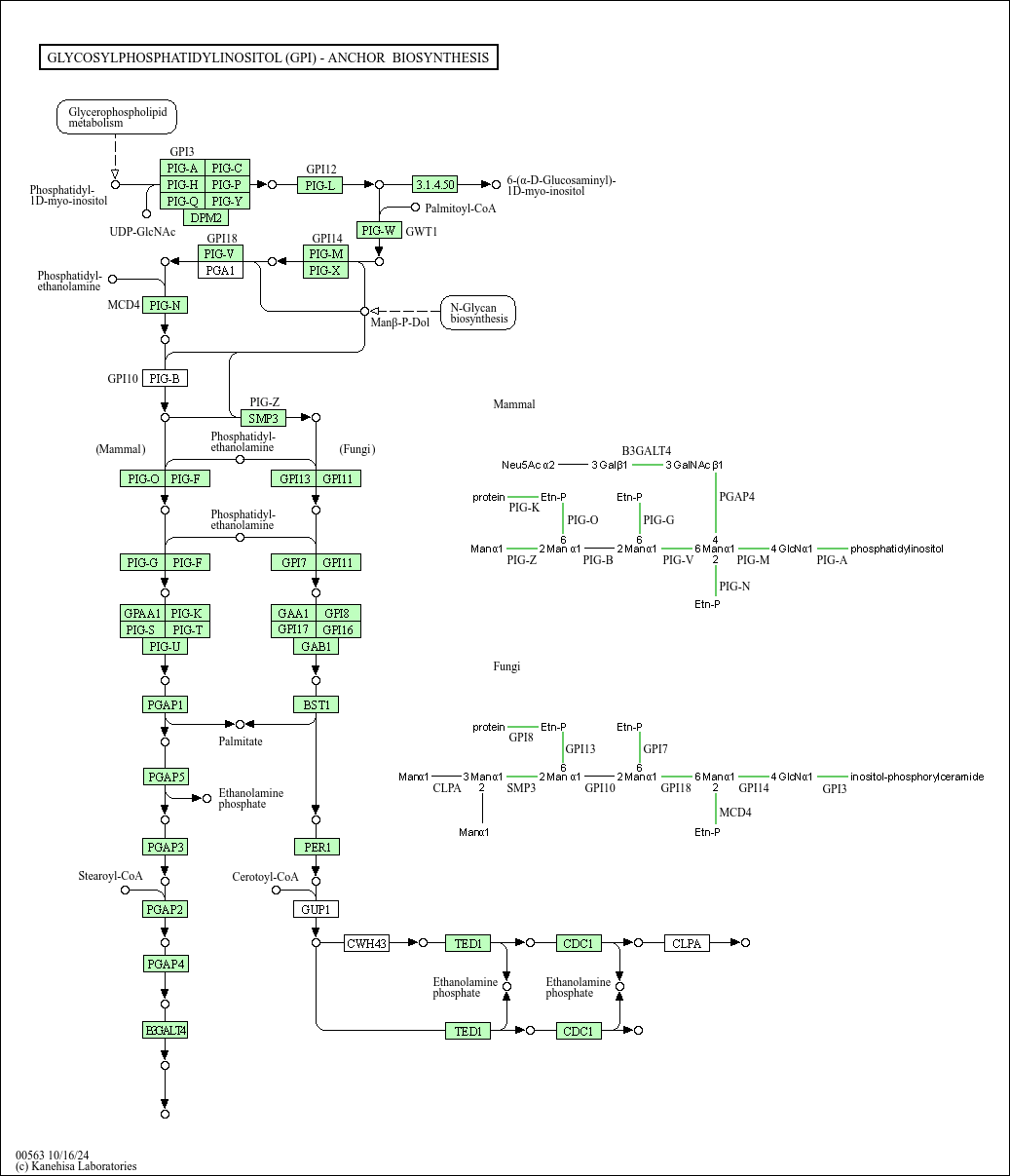 Cell surface proteins can be attached to the cell membrane via the glycolipid structure called glycosylphosphatidylinositol (GPI) anchor. Hundreds of GPI-anchored proteins have been identified in many eukaryotes ranging from protozoa and fungi to mammals. All protein-linked GPI anchors share a common core structure, characterized by the substructure Man (a1-4) GlcN (a1-6) myo-inositol-1P-lipid. Biosynthesis of GPI anchors proceeds in three stages: (i) preassembly of a GPI precursor in the ER membrane, (ii) attachment of the GPI to the C-terminus of a newly synthesized protein in the lumen of the ER, and (iii) lipid remodeling and/or carbohydrate side-chain modifications in the ER and the Golgi. Defects of GPI anchor biosynthesis gene result in a genetic disorder, paroxysmal nocturnal hemoglobinuria.