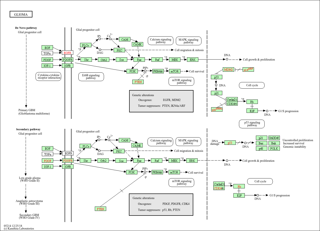 Gliomas are the most common of the primary brain tumors and account for more than 40% of all central nervous system neoplasms. Gliomas include tumours that are composed predominantly of astrocytes (astrocytomas), oligodendrocytes (oligodendrogliomas), mixtures of various glial cells (for example,oligoastrocytomas) and ependymal cells (ependymomas). The most malignant form of infiltrating astrocytoma - glioblastoma multiforme (GBM) - is one of the most aggressive human cancers. GBM may develop de novo (primary glioblastoma) or by progression from low-grade or anaplastic astrocytoma (secondary glioblastoma). Primary glioblastomas develop in older patients and typically show genetic alterations (EGFR amplification, p16/INK4a deletion, and PTEN mutations) at frequencies of 24-34%. Secondary glioblastomas develop in younger patients and frequently show overexpression of PDGF and CDK4 as well as p53 mutations (65%) and loss of Rb playing major roles in such transformations. Loss of PTEN has been implicated in both pathways, although it is much more common in the pathogenesis of primary GBM.