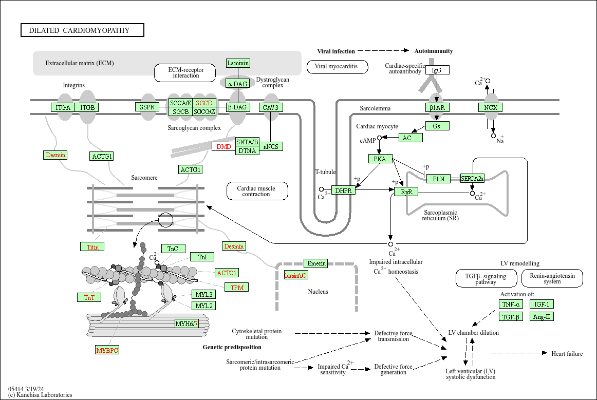 Dilated cardiomyopathy (DCM) is a heart muscle disease characterised by dilation and impaired contraction of the left or both ventricles that results in progressive heart failure and sudden cardiac death from ventricular arrhythmia. Genetically inherited forms of DCM ("familial" DCM) have been identified in 25-35% of patients presenting with this disease, and the inherited gene defects are an important cause of "familial" DCM. The pathophysiology may be separated into two categories: defects in force generation and defects in force transmission. In cases where an underlying pathology cannot be identified, the patient is diagnosed with an "idiopathic" DCM. Current hypotheses regarding causes of "idiopathic" DCM focus on myocarditis induced by enterovirus and subsequent autoimmune myocardium impairments. Antibodies to the beta1-adrenergic receptor (beta1AR), which are detected in a substantial number of patients with "idiopathic" DCM, may increase the concentration of intracellular cAMP and intracellular Ca2+, a condition often leading to a transient hyper-performance of the heart followed by depressed heart function and heart failure.