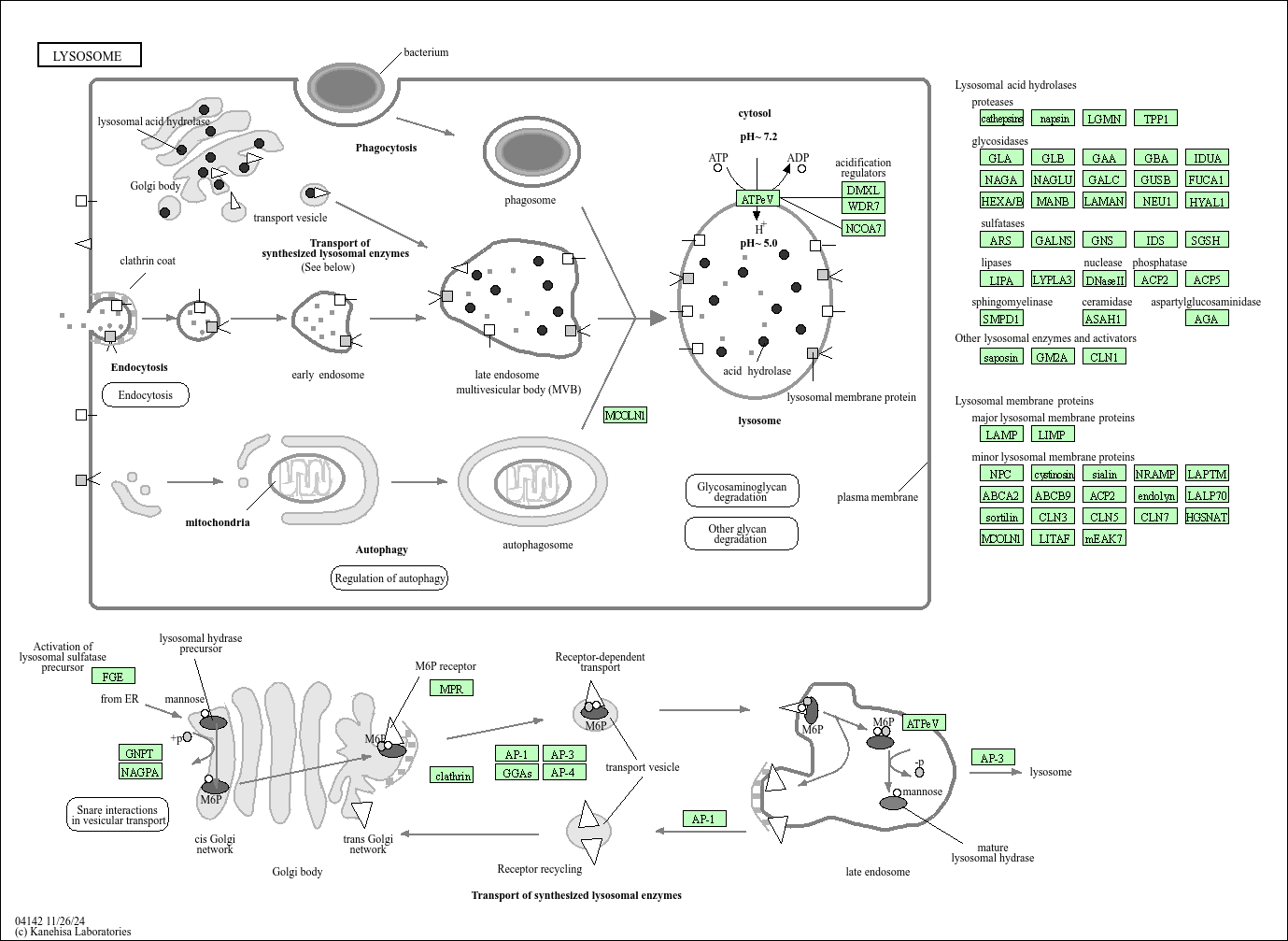 Lysosomes are membrane-delimited organelles in animal cells serving as the cell's main digestive compartment to which all sorts of macromolecules are delivered for degradation. They contain more than 40 hydrolases in an acidic environment (pH of about 5). After synthesis in the ER, lysosomal enzymes are decorated with mannose-6-phosphate residues, which are recognized by mannose-6-phosphate receptors in the trans-Golgi network. They are packaged into clathrin-coated vesicles and are transported to late endosomes. Substances for digestion are acquired by the lysosomes via a series of processes including endocytosis, phagocytosis, and autophagy.