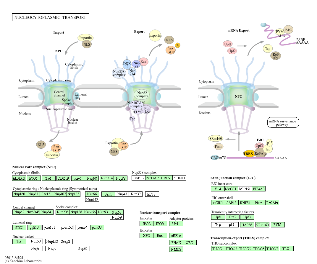 The exchange of molecules between the nucleus and cytoplasm is mediated through nuclear pore complexes (NPCs) embedded in the nuclear envelope. The NPC is composed of highly conserved, distinct structural modules: the inner pore ring, the cytoplasmic and nuclear rings as well as the cytoplasmic filaments and the nuclear basket. Nuclear transport receptors (e.g. importins and exportins) mediate translocation of cargos through the NPC. Cargo proteins harbouring a nuclear export signal (NES) bind to exportins and Ran-GTP to form an export complex in the nucleoplasm. Nuclear export of bulk mRNA is provided by the non-karyopherin transport proteins TAP-p15 in a Ran-GTP-independent manner. Several EJC factors are known to function in mRNA export.