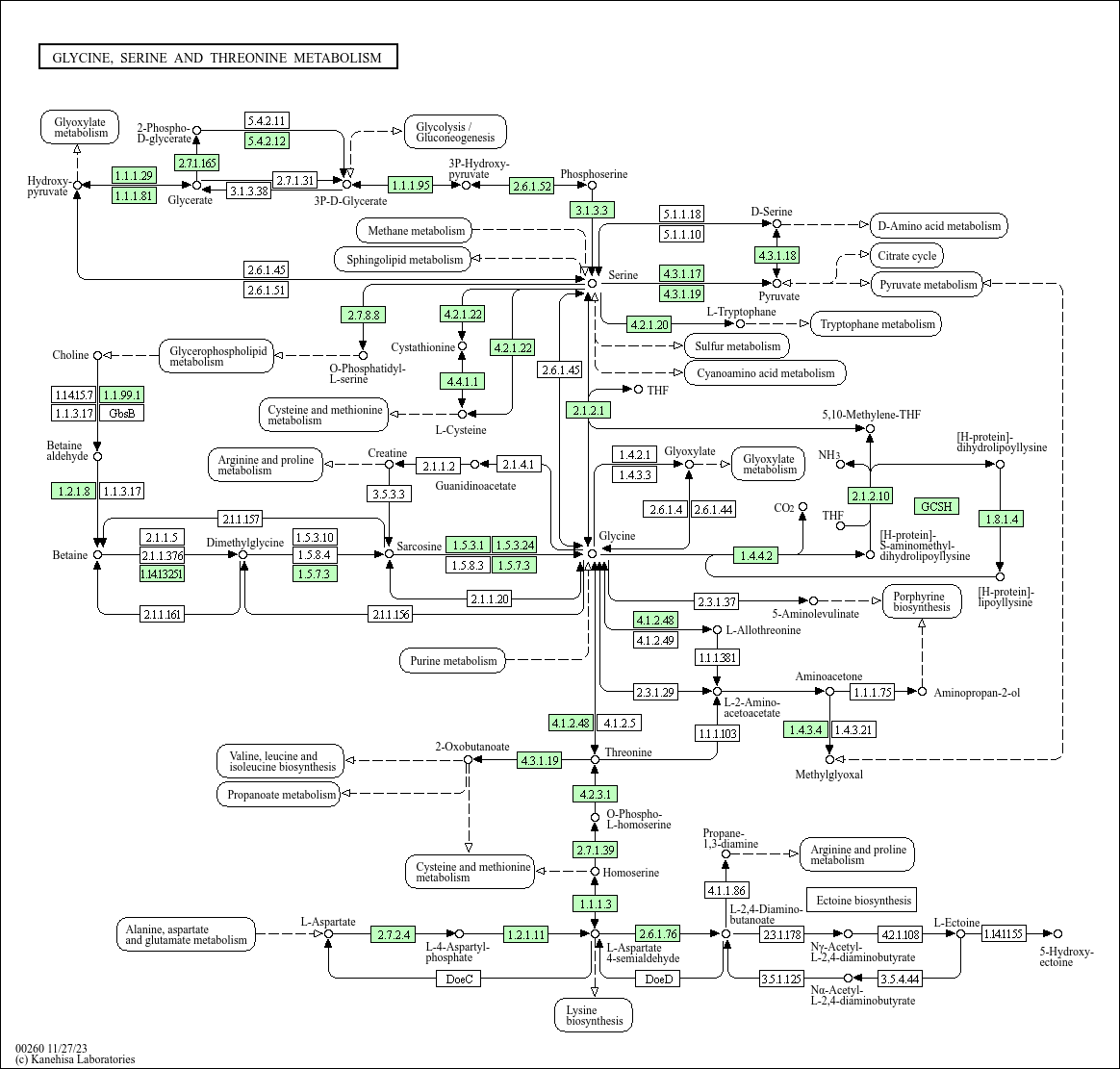 M00020], and glycine is derived from serine. Threonine is an essential amino acid, which animals cannot synthesize. In bacteria and plants, threonine is derived from aspartate [MD: