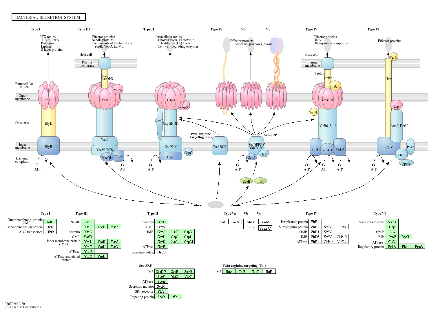 Gram-negative bacteria secrete a wide range of proteins whose functions include biogenesis of organelles, such as pilli and flagella, nutrient acquisition, virulence, and efflux of drugs and other toxins. Six distinct secretion systems have been shown to mediate protein export through the inner and outer membranes of Gram-negative bacteria. These pathways are highly conserved throughout the Gram-negative bacterial species. In Gram-positive bacteria, secreted proteins are commonly translocated across the single membrane by the Sec pathway or the two-arginine (Tat) pathway.