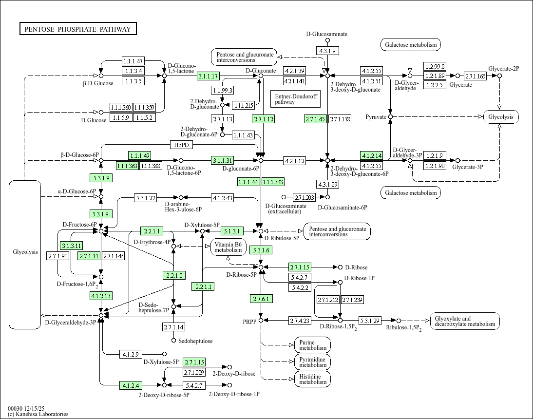 M00005] is an activated compound used in the biosynthesis of histidine and purine/pyrimidine nucleotides. This pathway map also shows the Entner-Doudoroff pathway where 6-P-gluconate is dehydrated and then cleaved into pyruvate and glyceraldehyde-3P [MD: