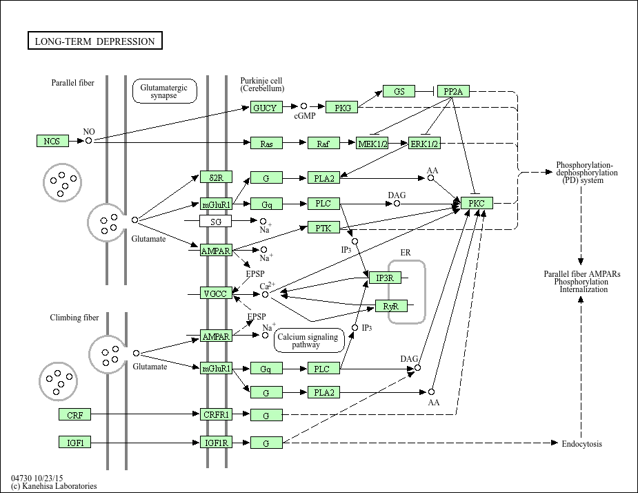 Cerebellar long-term depression (LTD), thought to be a molecular and cellular basis for cerebellar learning, is a process involving a decrease in the synaptic strength between parallel fiber (PF) and Purkinje cells (PCs) induced by the conjunctive activation of PFs and climbing fiber (CF). Multiple signal transduction pathways have been shown to be involved in this process. Activation of PFs terminating on spines in dendritic branchlets leads to glutamate release and activation of both AMPA and mGluRs. Activation of CFs, which make multiple synaptic contacts on proximal dendrites, also via AMPA receptors, opens voltage-gated calcium channels (VGCCs) and causes a generalized influx of calcium. These cellular signals, generated from two different synaptic origins, trigger a cascade of events culminating in a phosphorylation-dependent, long-term reduction in AMPA receptor sensitivity at the PF-PC synapse. This may take place either through receptor internalization and/or through receptor desensitization.