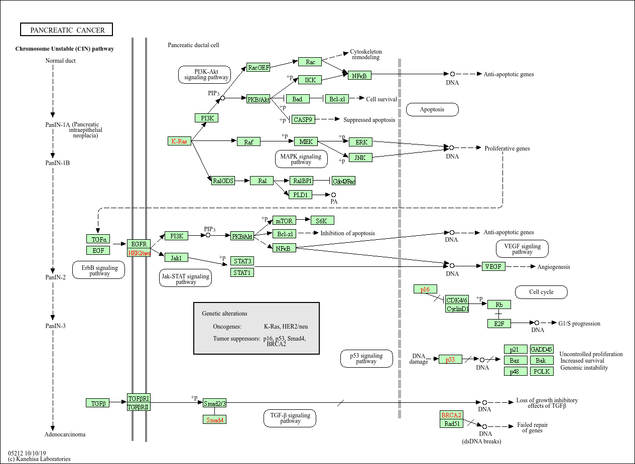Infiltrating ductal adenocarcinoma is the most common malignancy of the pancreas. When most investigators use the term 'pancreatic cancer' they are referring to pancreatic ductal adenocarcinoma (PDA). Normal duct epithelium progresses to infiltrating cancer through a series of histologically defined precursors (PanINs). The overexpression of HER-2/neu and activating point mutations in the K-ras gene occur early, inactivation of the p16 gene at an intermediate stage, and the inactivation of p53, SMAD4, and BRCA2 occur relatively late. Activated K-ras engages multiple effector pathways. Although EGF receptors are conventionally regarded as upstream activators of RAS proteins, they can also act as RAS signal transducers via RAS-induced autocrine activation of the EGFR family ligands. Moreover, PDA shows extensive genomic instability and aneuploidy. Telomere attrition and mutations in p53 and BRCA2 are likely to contribute to these phenotypes. Inactivation of the SMAD4 tumour suppressor gene leads to loss of the inhibitory influence of the transforming growth factor-beta signalling pathway.