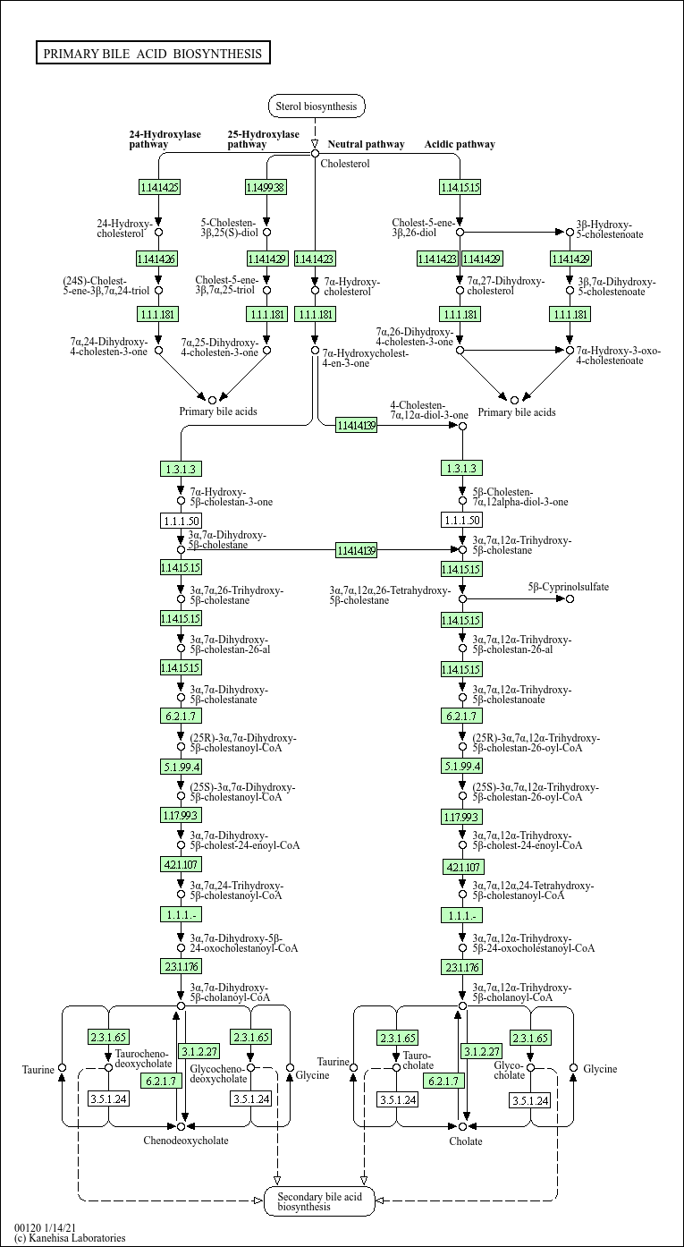 Bile acids are steroid carboxylic acids derived from cholesterol in vertebrates. The primary bile acids, cholic acid and chenodeoxycholic acid, are synthesized in the liver and conjugated with taurine or glycine before secretion via bile into the intestine. The conversion from cholesterol to cholic and chenodeoxycholic acids involves four steps: 1) the initiation of synthesis by 7alpha-hydroxylation of sterol precursors, 2) further modifications to the ring structures, 3) side-chain oxidation and shortening (cleavage) by three carbons, and 4) conjugation of the bile acid with taurine or glycine.