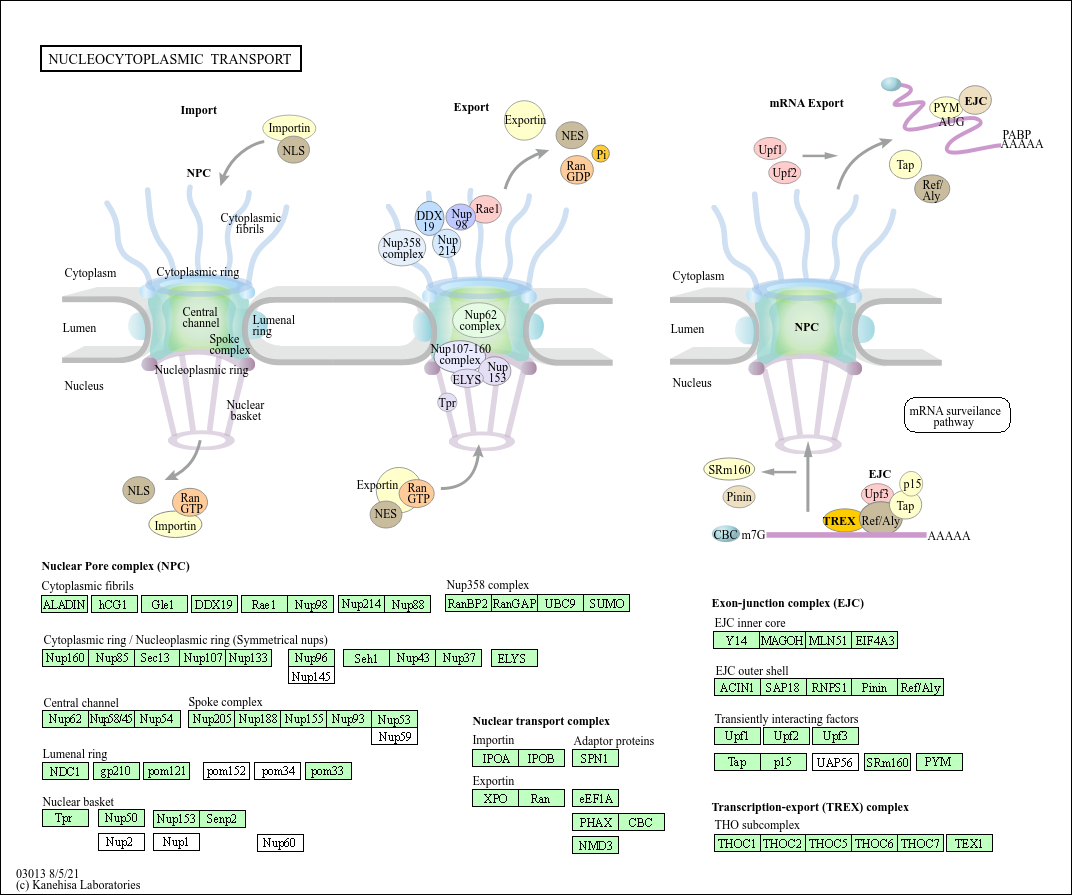 The exchange of molecules between the nucleus and cytoplasm is mediated through nuclear pore complexes (NPCs) embedded in the nuclear envelope. The NPC is composed of highly conserved, distinct structural modules: the inner pore ring, the cytoplasmic and nuclear rings as well as the cytoplasmic filaments and the nuclear basket. Nuclear transport receptors (e.g. importins and exportins) mediate translocation of cargos through the NPC. Cargo proteins harbouring a nuclear export signal (NES) bind to exportins and Ran-GTP to form an export complex in the nucleoplasm. Nuclear export of bulk mRNA is provided by the non-karyopherin transport proteins TAP-p15 in a Ran-GTP-independent manner. Several EJC factors are known to function in mRNA export.