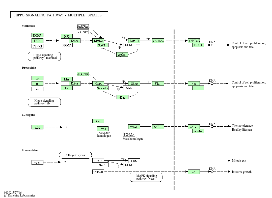 Hippo signaling pathways control diverse aspects of cell proliferation, survival, and morphogenesis in eukaryotes. The core organization of these networks is conserved over a billion years of evolution, with related forms described in animals and fungi. In Drosophila and mammals, Hippo/MST co-operate with Mats/Mob1 and Salvador/WW45 to activate Warts/LATS, which negatively regulates Yorkie/YAP. Yorkie/YAP interact with Scalloped/TEAD to promote gene transcriptions and control organ size through the balance between cell proliferation and apoptosis. In C. elegans, WTS-1 YAP-1 EGL-44 axis is conserved and regulates thermotolerance and healthy lifespan. In S. cerevisiae, the LATS-related Dbf2 or Dbf20 kinase in complex with Mob1 controls mitotic exit and cytokinesis, and the Hippo/MST family of kinases, STE-20, modulates Tec1, the putative yeast TEAD ortholog.