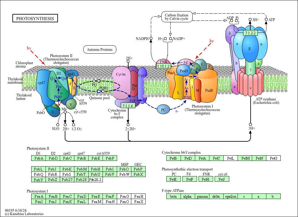 Photosynthesis in green plants and specialized bacteria is the process of utilizing light energy to synthesize organic compounds from carbon dioxide and water. It consists of the light dependent part (light reaction) and the light independent part (dark reaction, carbon fixation). The light reaction takes place in thylakoid, a membrane-bound compartment inside chloroplasts and cyanobacteria. The light energy is used by photosystems I and II to generate proton motive force and reducing power (NADPH or NADH). The proton motive force is used by ATP synthase to generate ATP, essentially in the same way as the mitochondrial respiratory chain. The supplies of ATP and NAD(P)H are then used to fix carbon dioxide.