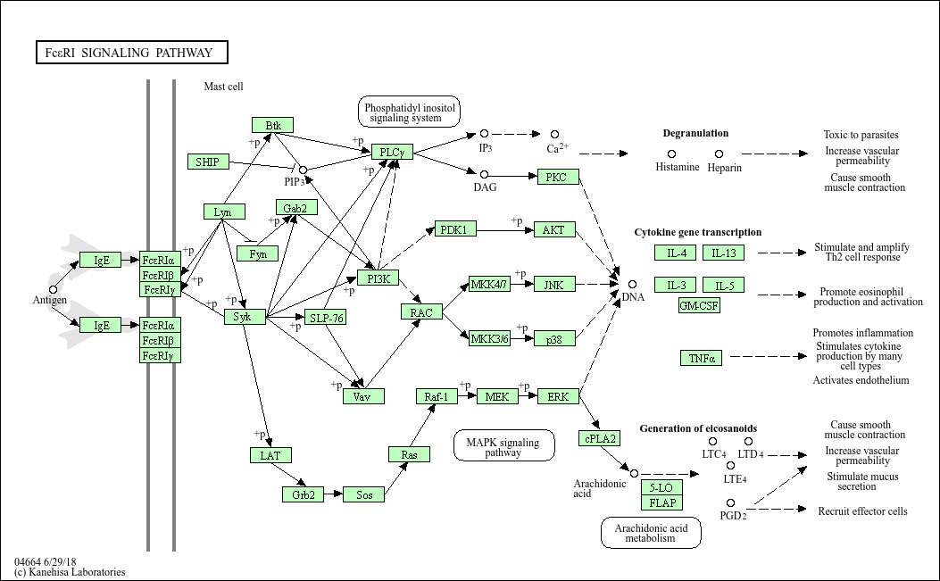 Fc epsilon RI-mediated signaling pathways in mast cells are initiated by the interaction of antigen (Ag) with IgE bound to the extracellular domain of the alpha chain of Fc epsilon RI. The activation pathways are regulated both positively and negatively by the interactions of numerous signaling molecules. Mast cells that are thus activated release preformed granules which contain biogenic amines (especially histamines) and proteoglycans (especially heparin). The activation of phospholipase A2 causes the release of membrane lipids followed by development of lipid mediators such as leukotrienes (LTC4, LTD4 and LTE4) and prostaglandins (especially PDG2). There is also secretion of cytokines, the most important of which are TNF-alpha, IL-4 and IL-5. These mediators and cytokines contribute to inflammatory responses.