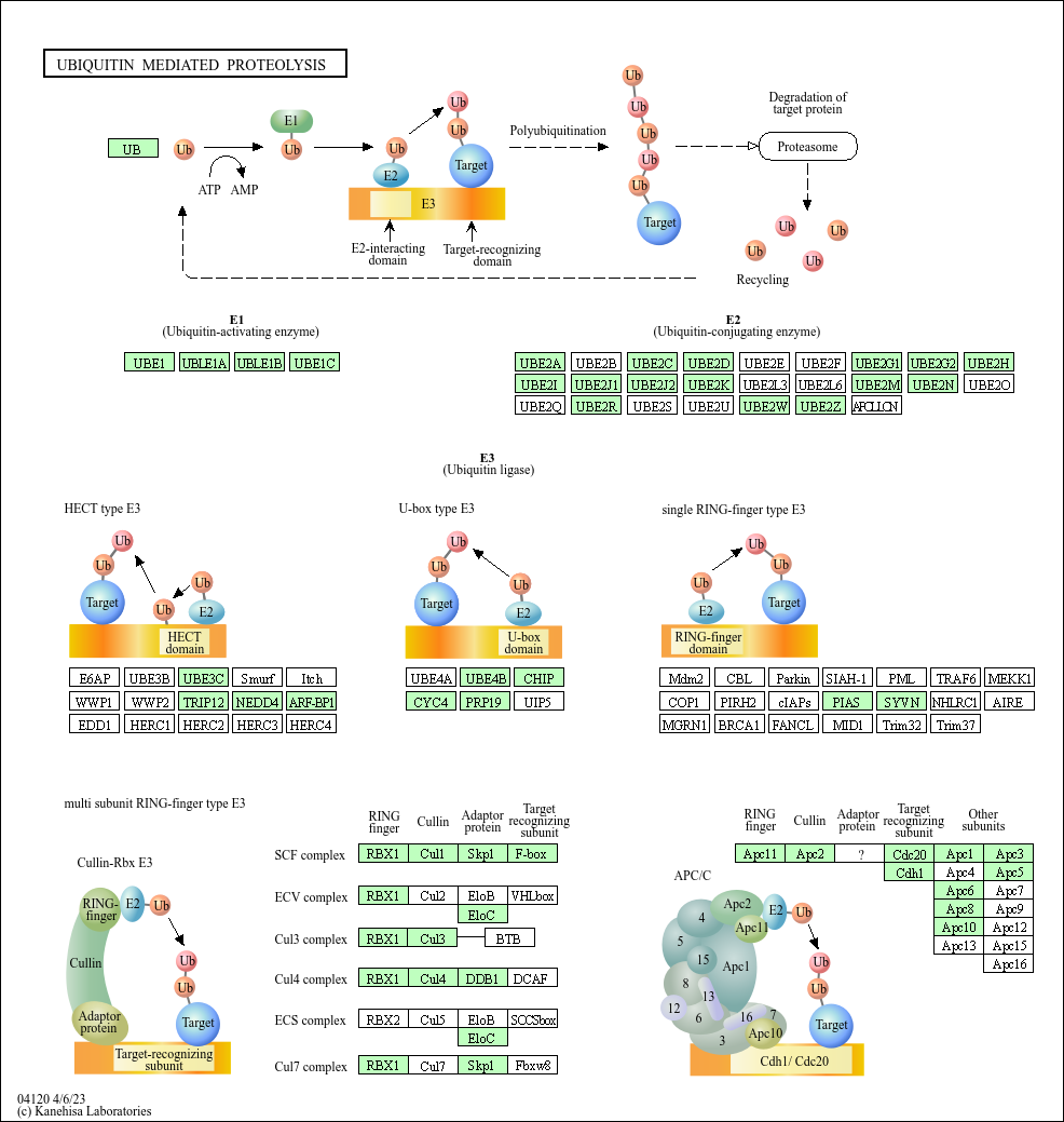 Protein ubiquitination plays an important role in eukaryotic cellular processes. It mainly functions as a signal for 26S proteasome dependent protein degradation. The addition of ubiquitin to proteins being degraded is performed by a reaction cascade consisting of three enzymes, named E1 (ubiquitin activating enzyme), E2 (ubiquitin conjugating enzyme), and E3 (ubiquitin ligase). Each E3 has specificity to its substrate, or proteins to be targeted by ubiquitination. Many E3s are discovered in eukaryotes and they are classified into four types: HECT type, U-box type, single RING-finger type, and multi-subunit RING-finger type. Multi-subunit RING-finger E3s are exemplified by cullin-Rbx E3s and APC/C. They consist of a RING-finger-containing subunit (RBX1 or RBX2) that functions to bind E2s, a scaffold-like cullin molecule, adaptor proteins, and a target recognizing subunit that binds substrates.