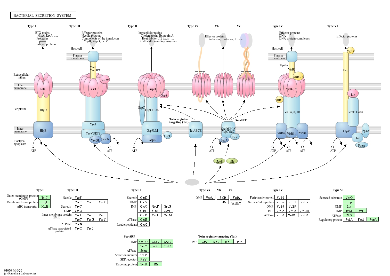 Gram-negative bacteria secrete a wide range of proteins whose functions include biogenesis of organelles, such as pilli and flagella, nutrient acquisition, virulence, and efflux of drugs and other toxins. Six distinct secretion systems have been shown to mediate protein export through the inner and outer membranes of Gram-negative bacteria. These pathways are highly conserved throughout the Gram-negative bacterial species. In Gram-positive bacteria, secreted proteins are commonly translocated across the single membrane by the Sec pathway or the two-arginine (Tat) pathway.