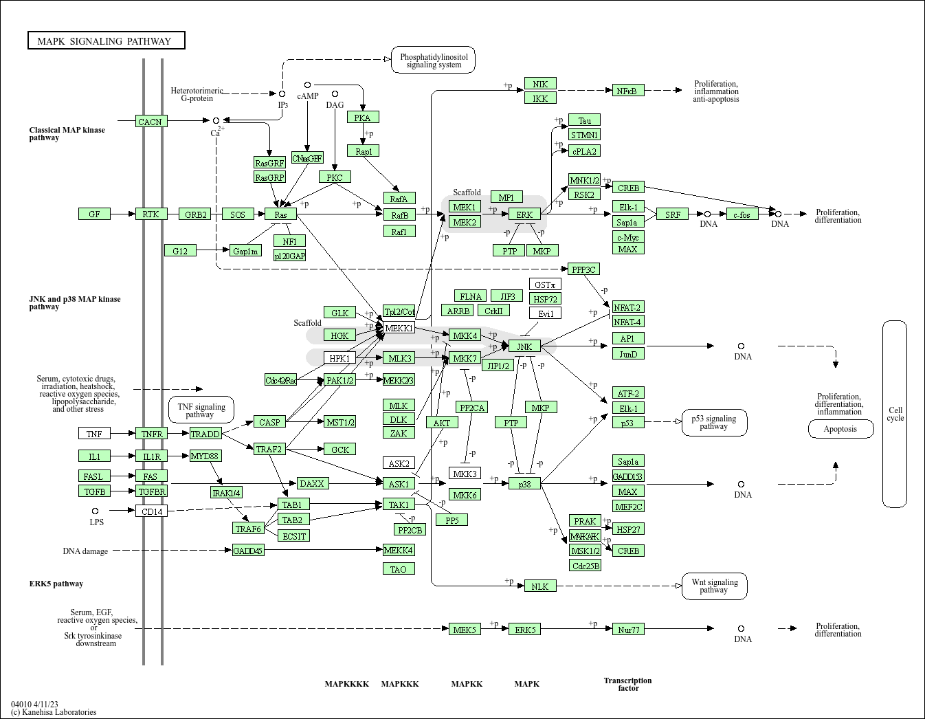 The mitogen-activated protein kinase (MAPK) cascade is a highly conserved module that is involved in various cellular functions, including cell proliferation, differentiation and migration. Mammals express at least four distinctly regulated groups of MAPKs, extracellular signal-related kinases (ERK)-1/2, Jun amino-terminal kinases (JNK1/2/3), p38 proteins (p38alpha/beta/gamma/delta) and ERK5, that are activated by specific MAPKKs: MEK1/2 for ERK1/2, MKK3/6 for the p38, MKK4/7 (JNKK1/2) for the JNKs, and MEK5 for ERK5. Each MAPKK, however, can be activated by more than one MAPKKK, increasing the complexity and diversity of MAPK signalling. Presumably each MAPKKK confers responsiveness to distinct stimuli. For example, activation of ERK1/2 by growth factors depends on the MAPKKK c-Raf, but other MAPKKKs may activate ERK1/2 in response to pro-inflammatory stimuli.