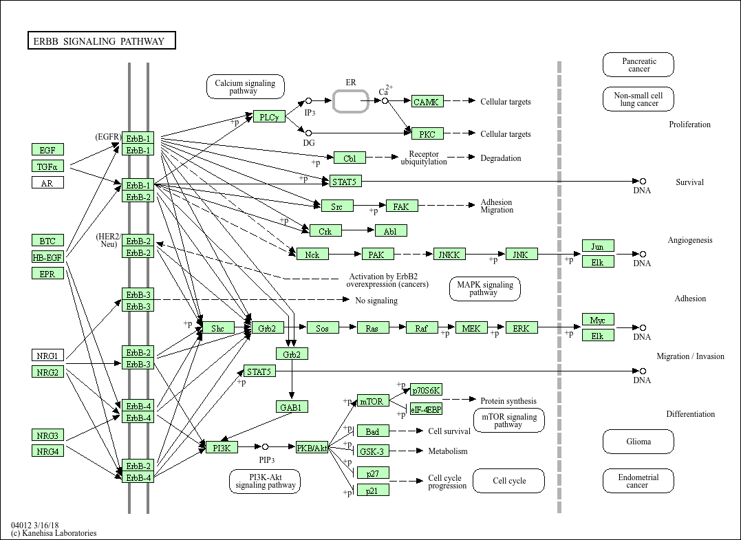 The ErbB family of receptor tyrosine kinases (RTKs) couples binding of extracellular growth factor ligands to intracellular signaling pathways regulating diverse biologic responses, including proliferation, differentiation, cell motility, and survival. Ligand binding to the four closely related members of this RTK family -epidermal growth factor receptor (EGFR, also known as ErbB-1 or HER1), ErbB-2 (HER2), ErbB-3 (HER3), and ErbB-4 (HER4)-induces the formation of receptor homo- and heterodimers and the activation of the intrinsic kinase domain, resulting in phosphorylation on specific tyrosine residues (pY) within the cytoplasmic tail. Signaling effectors containing binding pockets for pY-containing peptides are recruited to activated receptors and induce the various signaling pathways. The Shc- and/or Grb2-activated mitogen-activated protein kinase (MAPK) pathway is a common target downstream of all ErbB receptors. Similarly, the phosphatidylinositol-3-kinase (PI-3K) pathway is directly or indirectly activated by most ErbBs. Several cytoplasmic docking proteins appear to be recruited by specific ErbB receptors and less exploited by others. These include the adaptors Crk, Nck, the phospholipase C gamma (PLCgamma), the intracellular tyrosine kinase Src, or the Cbl E3 ubiquitin protein ligase.