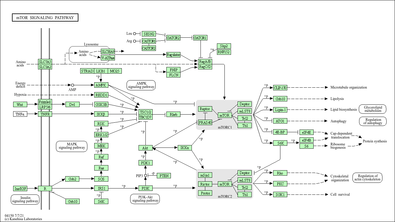 The mammalian (mechanistic) target of rapamycin (mTOR) is a highly conserved serine/threonine protein kinase, which exists in two complexes termed mTOR complex 1 (mTORC1) and 2 (mTORC2). mTORC1 contains mTOR, Raptor, PRAS40, Deptor, mLST8, Tel2 and Tti1. mTORC1 is activated by the presence of growth factors, amino acids, energy status, stress and oxygen levels to regulate several biological processes, including lipid metabolism, autophagy, protein synthesis and ribosome biogenesis. On the other hand, mTORC2, which consists of mTOR, mSin1, Rictor, Protor, Deptor, mLST8, Tel2 and Tti1, responds to growth factors and controls cytoskeletal organization, metabolism and survival.