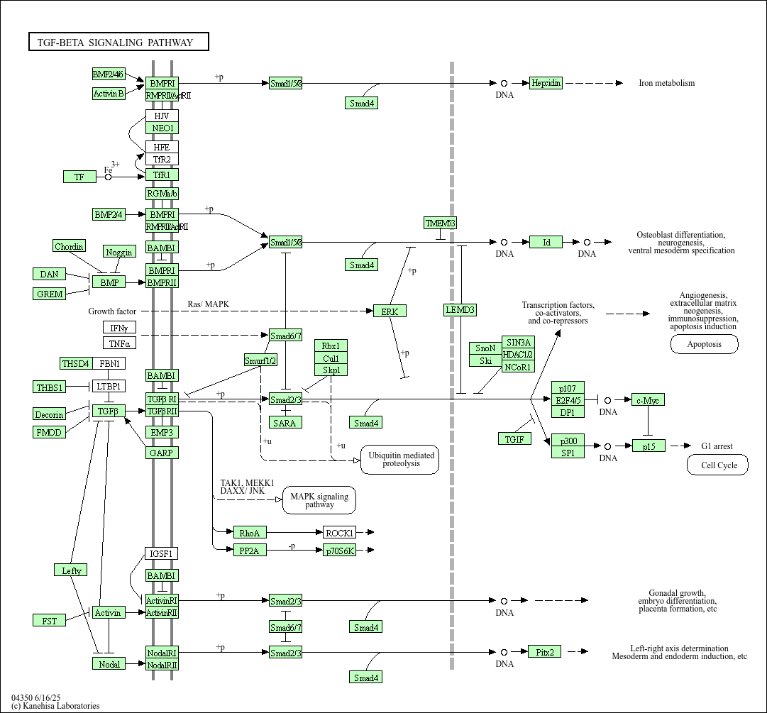 The transforming growth factor-beta (TGF-beta) family members, which include TGF-betas, activins and bone morphogenetic proteins (BMPs), are structurally related secreted cytokines found in species ranging from worms and insects to mammals. A wide spectrum of cellular functions such as proliferation, apoptosis, differentiation and migration are regulated by TGF-beta family members. TGF-beta family member binds to the Type II receptor and recruits Type I, whereby Type II receptor phosphorylates and activates Type I. The Type I receptor, in turn, phosphorylates receptor-activated Smads ( R-Smads: Smad1, Smad2, Smad3, Smad5, and Smad8). Once phosphorylated, R-Smads associate with the co-mediator Smad, Smad4, and the heteromeric complex then translocates into the nucleus. In the nucleus, Smad complexes activate specific genes through cooperative interactions with other DNA-binding and coactivator (or co-repressor) proteins.