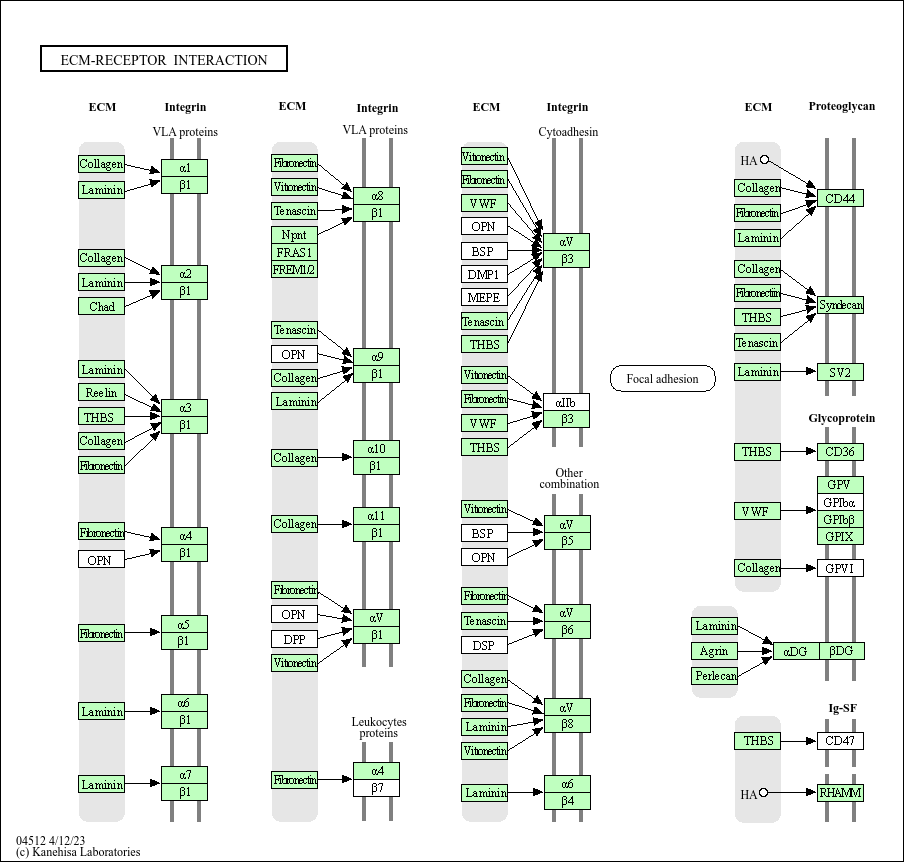 The extracellular matrix (ECM) consists of a complex mixture of structural and functional macromolecules and serves an important role in tissue and organ morphogenesis and in the maintenance of cell and tissue structure and function. Specific interactions between cells and the ECM are mediated by transmembrane molecules, mainly integrins and perhaps also proteoglycans, CD36, or other cell-surface-associated components. These interactions lead to a direct or indirect control of cellular activities such as adhesion, migration, differentiation, proliferation, and apoptosis. In addition, integrins function as mechanoreceptors and provide a force-transmitting physical link between the ECM and the cytoskeleton. Integrins are a family of glycosylated, heterodimeric transmembrane adhesion receptors that consist of noncovalently bound alpha- and beta-subunits.