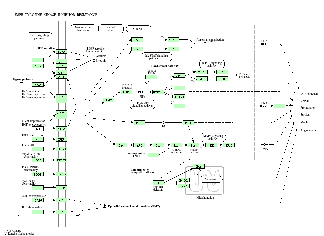 EGFR is a tyrosine kinase that participates in the regulation of cellular homeostasis. EGFR also serves as a stimulus for cancer growth. EGFR gene mutations and protein overexpression, both of which activate down- stream pathways, are associated with cancers, especially lung cancer. Several tyrosine kinase inhibitor (TKI) therapies against EGFR are currently administered and are initially effective in cancer patients who have EGFR mutations or aberrant activation of EGFR. However, the development of TKI resistance is common and results in the recurrence of tumors. Studies over the last decade have identified mechanisms that drive resistance to EGFR TKI treatment. Most outstanding mechanisms are: the secondary EGFR mutation (T790M), activation of alternative pathways (c-Met, HGF, AXL), aberrance of the downstream pathways (K-RAS mutations, loss of PTEN), impairment of the EGFR-TKIs-mediated apoptosis pathway (BCL2-like 11/BIM deletion polymorphism), histologic transformation, etc.