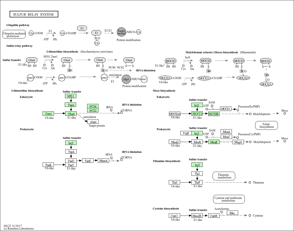 Ubiquitin and ubiquitin-like proteins (Ubls) are signalling messengers that control many cellular functions, such as cell proliferation, apoptosis, and DNA repair. It is suggested that Ub-protein modification evolved from prokaryotic sulfurtransfer systems. Molybdenum cofactor (Moco) and thiamin are sulfur-containing cofactors whose biosynthesis includes a key sulfur transfer step that uses unique sulfur carrier proteins, MoaD and ThiS. Ubiquitin, MoaD, and ThiS are all structurally related proteins whose C-termini are activated through adenylation by homologous E1-like enzymes. s2T biosynthesis may share similar chemistry with Moco and thiamin synthesis. In Saccharomyces cerevisiae, Urm1 and Uba4 function as part of a ubl protein conjugation system, though they have sequence homology to bacterial sulfur-transfer enzymes and the ability to function in sulfur transfer.