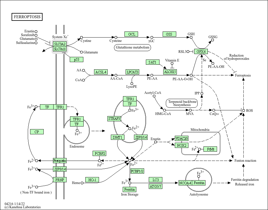 Ferroptosis is a regulated form of cell death and characterized by a production of reactive oxygen species (ROS) from accumulated iron and lipid peroxidation. It can be induced by experimental compounds (e.g.,erastin, RSL3) or clinical drugs(e.g., sulfasalazine, sorafenib) in cancer cell and certain normal cells. It is involved in multiple physiological and pathological processes, such as cancer cell death, neurodegenerative disease, tissue damage and acute renal failure.