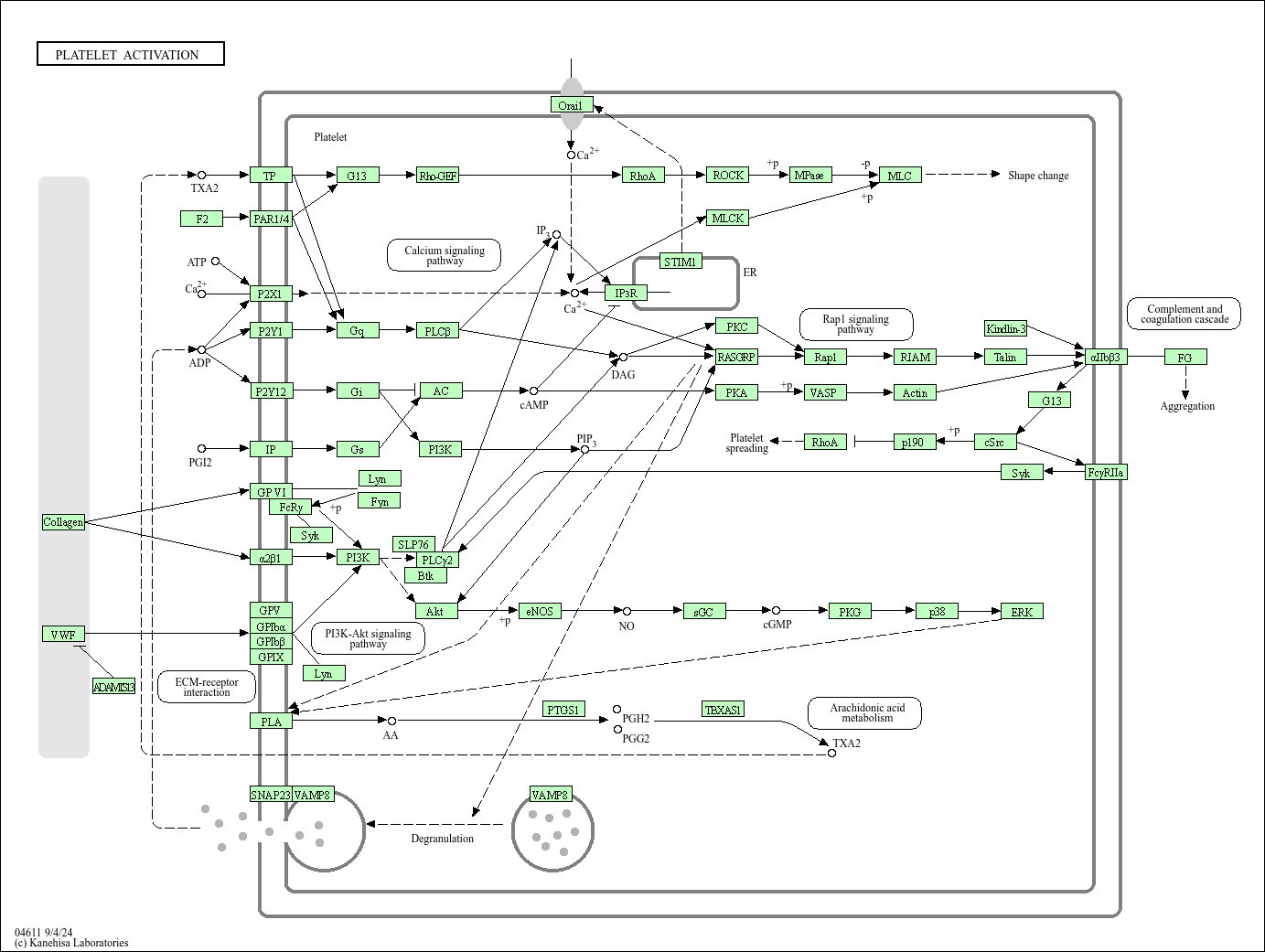 Platelets play a key and beneficial role for primary hemostasis on the disruption of the integrity of vessel wall. Platelet adhesion and activation at sites of vascular wall injury is initiated by adhesion to adhesive macromolecules, such as collagen and von Willebrand factor (vWF), or by soluble platelet agonists, such as ADP, thrombin, and thromboxane A2. Different receptors are stimulated by various agonists, almost converging in increasing intracellular Ca2+ concentration that stimulate platelet shape change and granule secretion and ultimately induce the "inside-out" signaling process leading to activation of the ligand-binding function of integrin alpha IIb beta 3. Binding of alpha IIb beta 3 to its ligands, mainly fibrinogen, mediates platelet adhesion and aggregation and triggers "outside-in" signaling, resulting in platelet spreading, additional granule secretion, stabilization of platelet adhesion and aggregation, and clot retraction.