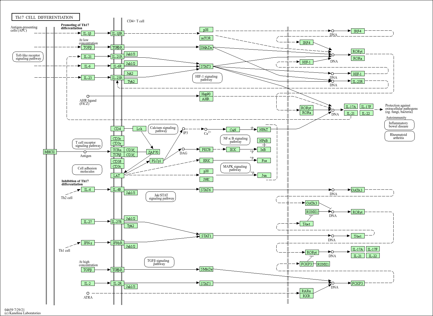 Interleukin (IL)-17-producing helper T (Th17) cells serve as a subset of CD4+ T cells involved in epithelial cell- and neutrophil mediated immune responses against extracellular microbes and in the pathogenesis of autoimmune diseases. In vivo, Th17 differentiation requires antigen presentation and co-stimulation, and activation of antigen presenting-cells (APCs) to produce TGF-beta, IL-6, IL-1, IL-23 and IL-21. This initial activation results in the activation and up-regulation of STAT3, ROR(gamma)t and other transcriptional factors in CD4+ T cells, which bind to the promoter regions of the IL-17, IL-21 and IL-22 genes and induce IL-17, IL-21 and IL-22. In contrast, the differentiation of Th17 cells and their IL-17 expression are negatively regulated by IL-2, Th2 cytokine IL-4, IL-27 and Th1 cytokine IFN-gamma through STAT5, STAT6 and STAT1 activation, respectively. Retinoid acid and the combination of IL-2 and TGF-beta upregulate Foxp3, which also downregulates cytokines like IL-17 and IL-21. The inhibition of Th17 differentiation may serve as a protective strategy to 'fine-tune' the expression IL-17 so it does not cause excessive inflammation. Thus, balanced differentiation of Th cells is crucial for immunity and host protection.