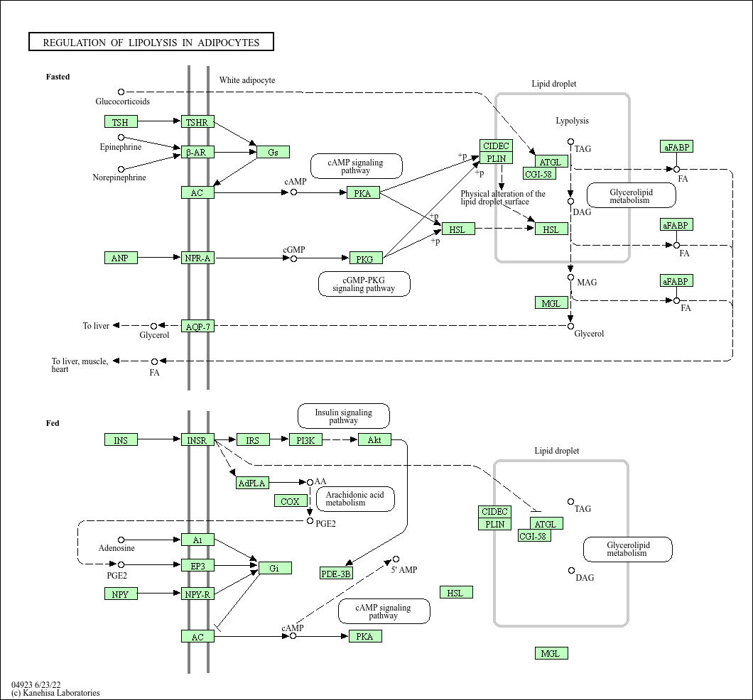 Lipolysis in adipocytes, the hydrolysis of triacylglycerol (TAG) to release fatty acids (FAs) and glycerol for use by other organs as energy substrates, is a unique function of white adipose tissue. Lipolysis is under tight hormonal control. During fasting, catecholamines, by binding to Gs-coupled-adrenergic receptors (-AR), activate adenylate cyclase (AC) to increase cAMP and activate protein kinase A (PKA). PKA phosphorylates target protein such as hormone-sensitive lipase (HSL) and perilipin 1 (PLIN). PLIN phosphorylation is a key event in the sequential activation of TAG hydrolysis involving adipose triglyceride lipase (ATGL), HSL, and monoglyceride lipase (MGL). During the fed state, insulin, through activation of phosphodiesterase-3B (PDE-3B), inhibits catecholamine-induced lipolysis via the degradation of cAMP.