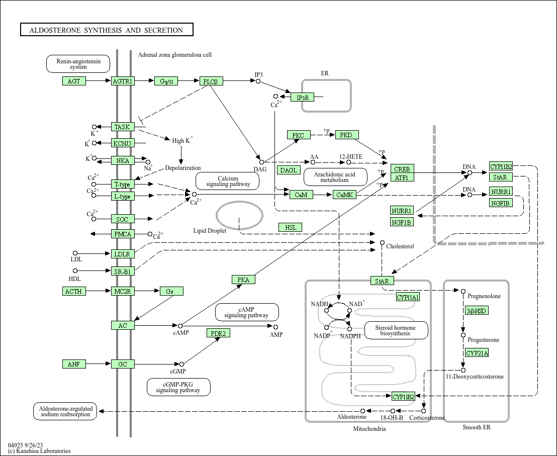 Aldosterone is a steroid hormone synthesized in and secreted from the outer layer of the adrenal cortex, the zona glomerulosa. Aldosterone plays an important role in the regulation of systemic blood pressure through the absorption of sodium and water. Angiotensin II (Ang II), potassium (K+) and adrenocorticotropin (ACTH) are the main extracellular stimuli which regulate aldosterone secretion. These physiological agonists all converge on two major intracellular signaling pathways: calcium (Ca2+) mobilization and an increase in cAMP production. The increase in cytosolic calcium levels activates calcium/calmodulin- dependent protein kinases (CaMK), and the increased cAMP levels stimulate the activity of cAMP-dependent protein kinase, or protein kinase A (PKA). The activated CaMK, and possibly PKA, activates transcription factors (NURR1 and NGF1B, CREB) to induce StAR and CYP11B2 expression, the early and late rate- limiting steps in aldosterone biosynthesis, respectively, thereby stimulating aldosterone secretion.