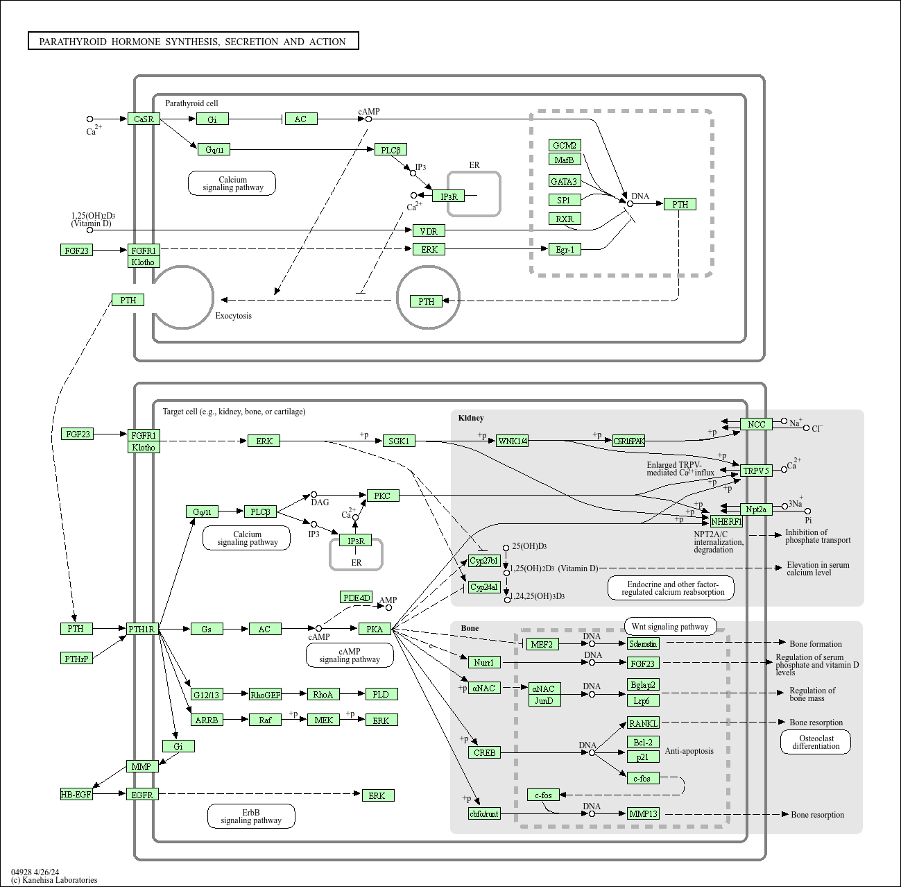 Parathyroid hormone (PTH) is a key regulator of calcium and phosphorus homeostasis. The principal regulators of PTH secretion are extracellular ionized calcium (Ca2+) and 1,25-dihydroxyvitamin D (1,25(OH)2D3). Under conditions of dietary Ca restriction, a decrement in serum Ca concentration induces release of PTH from the parathyroid gland. PTH acts on bone and kidney to stimulate bone turnover, increase the circulating levels of 1,25(OH)2D3 and calcium and inhibit the reabsorption of phosphate from the glomerular filtrate. This hormone exerts its actions via binding to the PTH/PTH-related peptide receptor (PTH1R). PTH1R primarily activates two sub-types of heterotrimeric Gproteins: Gs and Gq , which in turn regulate the activity of adenylyl cyclases and phospholipase C (PLC) that control the flow of cAMP/PKA and IP/PKC signaling cascades, respectively.
