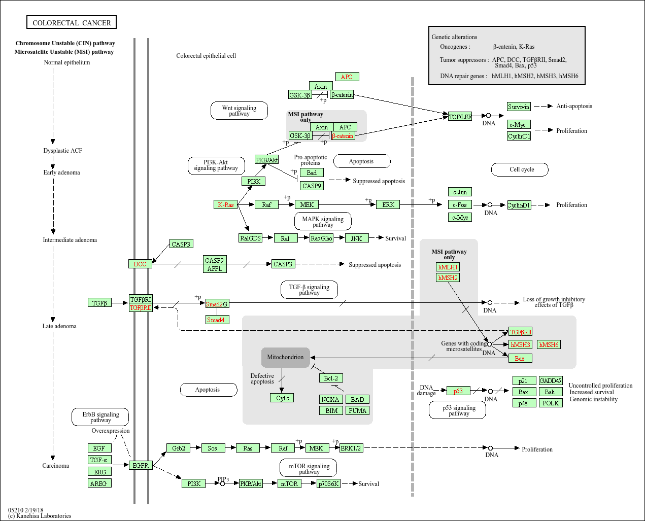 Colorectal cancer (CRC) is the second largest cause of cancer-related deaths in Western countries. CRC arises from the colorectal epithelium as a result of the accumulation of genetic alterations in defined oncogenes and tumour suppressor genes (TSG). Two major mechanisms of genomic instability have been identified in sporadic CRC progression. The first, known as chromosomal instability (CIN), results from a series of genetic changes that involve the activation of oncogenes such as K-ras and inactivation of TSG such as p53, DCC/Smad4, and APC. The second, known as microsatellite instability (MSI), results from inactivation of the DNA mismatch repair genes MLH1 and/or MSH2 by hypermethylation of their promoter, and secondary mutation of genes with coding microsatellites, such as transforming growth factor receptor II (TGF-RII) and BAX. Hereditary syndromes have germline mutations in specific genes (mutation in the tumour suppressor gene APC on chromosome 5q in FAP, mutated DNA mismatch repair genes in HNPCC).