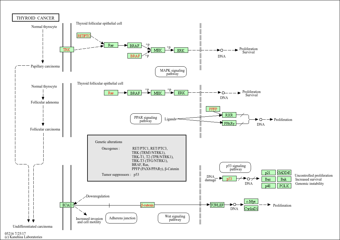 Thyroid cancer is the most common endocrine malignancy and accounts for the majority of endocrine cancer- related deaths each year. More than 95% of thyroid carcinomas are derived from follicular cells. Their behavior varies from the indolent growing, well-differentiated papillary and follicular carcinomas (PTC and FTC, respectively) to the extremely aggressive undifferentiated carcinoma (UC). Somatic rearrangements of RET and TRK are almost exclusively found in PTC and may be found in early stages. The most distinctive molecular features of FTC are the prominence of aneuploidy and the high prevalence of RAS mutations and PAX8-PPAR{gamma} rearrangements. p53 seems to play a crucial role in the dedifferentiation process of thyroid carcinoma.