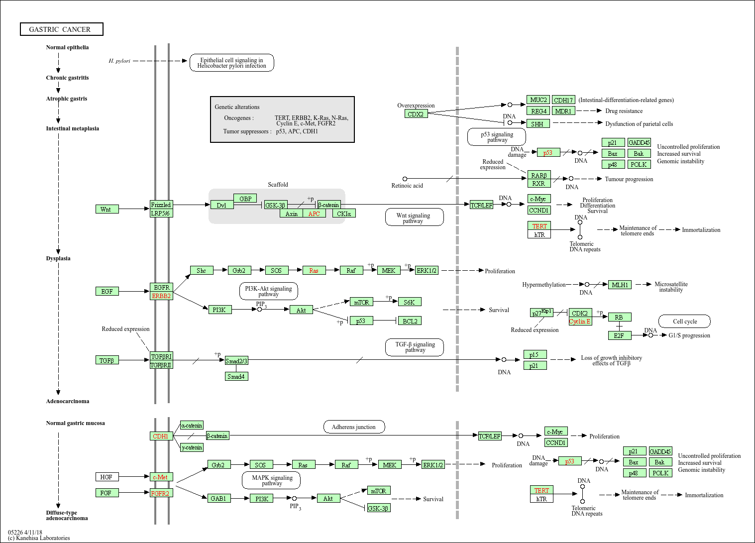 Gastric cancer (GC) is one of the world's most common cancers. According to Lauren's histological classification gastric cancer is divided into two distinct histological groups - the intestinal and diffuse types. Several genetic changes have been identified in intestinal-type GC. The intestinal metaplasia is characterized by mutations in p53 gene, reduced expression of retinoic acid receptor beta (RAR-beta) and hTERT expression. Gastric adenomas furthermore display mutations in the APC gene, reduced p27 expression and cyclin E amplification. In addition, amplification and overexpression of c-ErbB2, reduced TGF-beta receptor type I (TGFBRI) expression and complete loss of p27 expression are commonly observed in more advanced GC. The main molecular changes observed in diffuse-type GCs include loss of E-cadherin function by mutations in CDH1 and amplification of MET and FGFR2F.