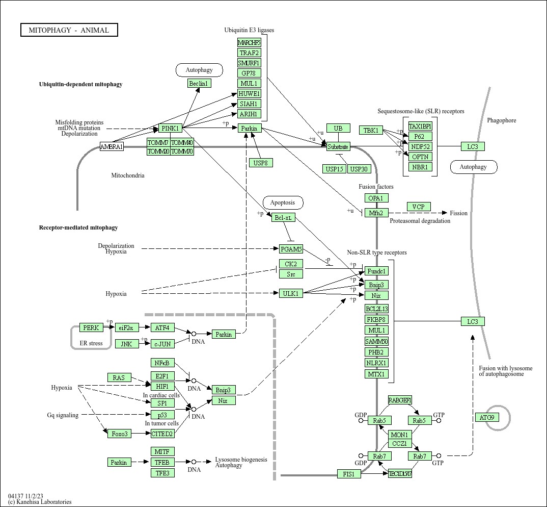 Mitochondria act as the energy powerhouse of the cell, and are essential for eukaryotic cells to grow and function normally. However, deleterious byproducts of oxidative phosphorylation process called reactive oxidative species (ROS) lead to mitochondrial dysfunction. If the damage is too excessive to be repaired, such mitochondria are selectively recognized and targeted for degradation by a specific mode of autophagy, termed mitophagy. The loss of the mitochondrial membrane potential can induce mitophagy, involving the kinase PINK1 and the E3 ligase Parkin. PINK1 serves as the sensor for the mitochondrial depolarization and recruits Parkin, followed by ubiquitin-dependent recruitment of mitophagy receptors. There are also several PINK1/Parkin-independent mitophagy pathways, in which a group of LIR-containing receptors are required in response to different stimuli. Mitophagy contributes to the maintenance of a healthy mitochondrial network and the prevention of programmed cell death.