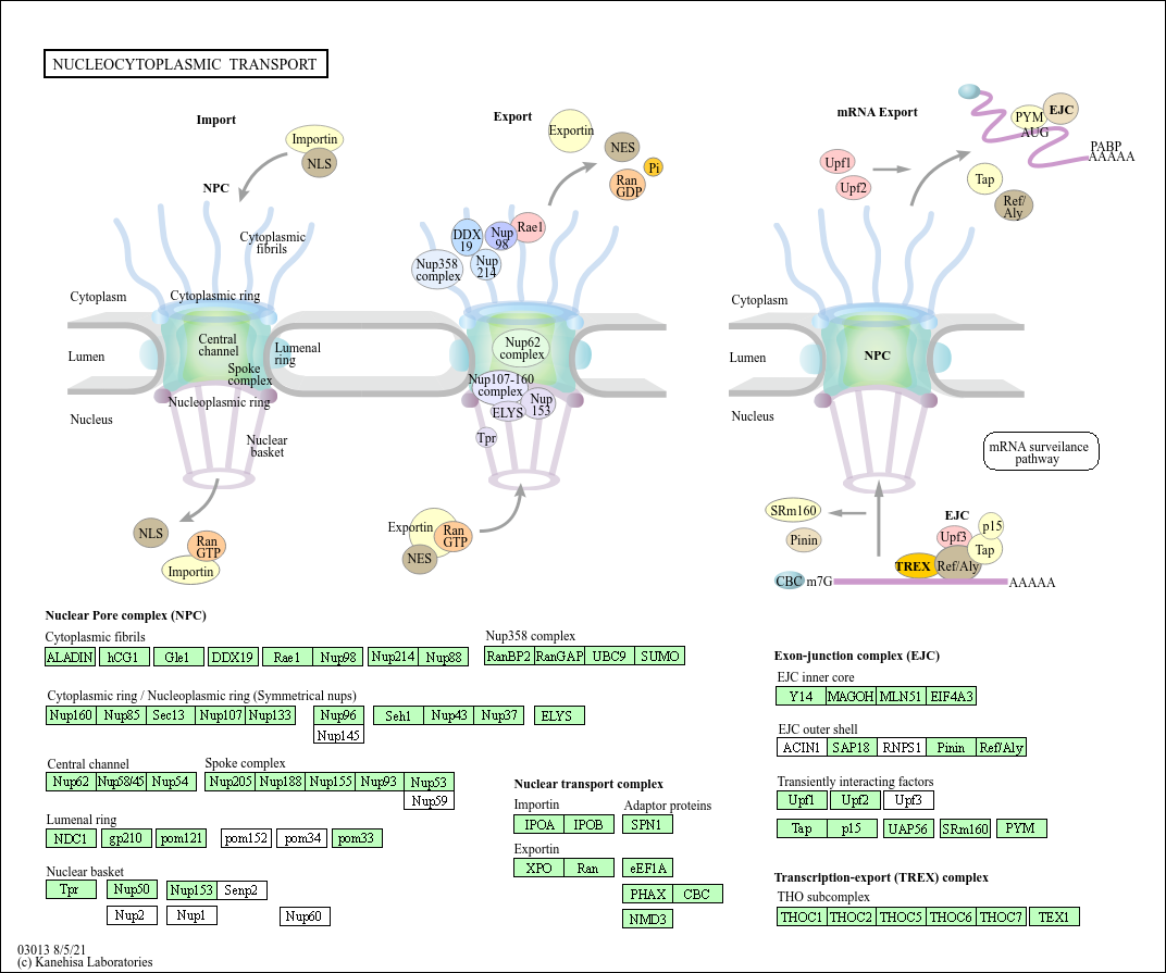 The exchange of molecules between the nucleus and cytoplasm is mediated through nuclear pore complexes (NPCs) embedded in the nuclear envelope. The NPC is composed of highly conserved, distinct structural modules: the inner pore ring, the cytoplasmic and nuclear rings as well as the cytoplasmic filaments and the nuclear basket. Nuclear transport receptors (e.g. importins and exportins) mediate translocation of cargos through the NPC. Cargo proteins harbouring a nuclear export signal (NES) bind to exportins and Ran-GTP to form an export complex in the nucleoplasm. Nuclear export of bulk mRNA is provided by the non-karyopherin transport proteins TAP-p15 in a Ran-GTP-independent manner. Several EJC factors are known to function in mRNA export.