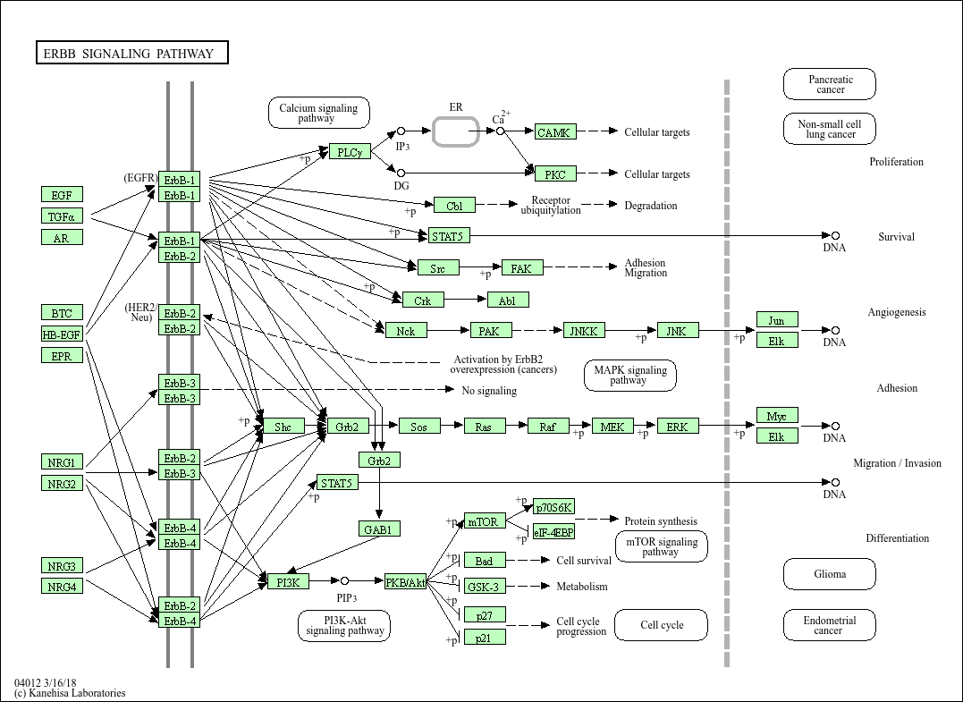 The ErbB family of receptor tyrosine kinases (RTKs) couples binding of extracellular growth factor ligands to intracellular signaling pathways regulating diverse biologic responses, including proliferation, differentiation, cell motility, and survival. Ligand binding to the four closely related members of this RTK family -epidermal growth factor receptor (EGFR, also known as ErbB-1 or HER1), ErbB-2 (HER2), ErbB-3 (HER3), and ErbB-4 (HER4)-induces the formation of receptor homo- and heterodimers and the activation of the intrinsic kinase domain, resulting in phosphorylation on specific tyrosine residues (pY) within the cytoplasmic tail. Signaling effectors containing binding pockets for pY-containing peptides are recruited to activated receptors and induce the various signaling pathways. The Shc- and/or Grb2-activated mitogen-activated protein kinase (MAPK) pathway is a common target downstream of all ErbB receptors. Similarly, the phosphatidylinositol-3-kinase (PI-3K) pathway is directly or indirectly activated by most ErbBs. Several cytoplasmic docking proteins appear to be recruited by specific ErbB receptors and less exploited by others. These include the adaptors Crk, Nck, the phospholipase C gamma (PLCgamma), the intracellular tyrosine kinase Src, or the Cbl E3 ubiquitin protein ligase.