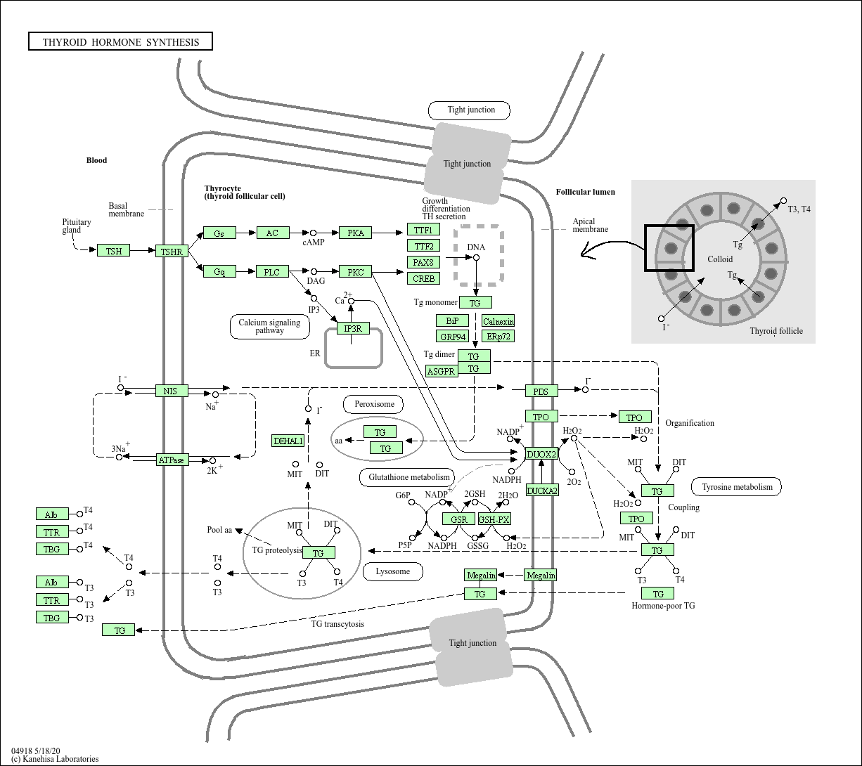 Thyroid hormones triiodothyronine (T3) and thyroxine (T4) are essential for normal development, growth and metabolic homeostasis in all vertebrates, and synthesized in the thyroid gland. The functional unit of the thyroid gland is the follicle, delimited by a monolayer of thyrocytes. Polarized thyrocytes surround the follicular lumen; with their basal and apical surfaces facing the bloodstream and the lumen, respectively. To synthesize thyroid hormones, thyrocytes take up iodide at their basal side and concentrate it into the lumen. They also secrete in this lumen the specialized protein thyroglobulin (TG) which serves as a store for the hormones. In the follicular lumen oxidation of iodine, iodination of tyrosines (MIT, 3-monoiodotyrosine; DIT, 3,5-diiodotyrosine) and coupling of iodotyrosines takes place on tyrosine residues in TG, resulting in T3 and T4 synthesis. Iodinated TG is resorbed through the apical membrane and degraded to form T3/T4 in lysosomes; the T3/T4 is then secreted through the basal membrane.