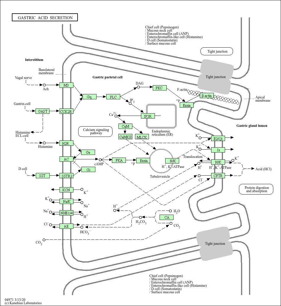 Gastric acid is a key factor in normal upper gastrointestinal functions, including protein digestion and calcium and iron absorption, as well as providing some protection against bacterial infections. The principal stimulants of acid secretion at the level of the parietal cell are histamine (paracrine), gastrin (hormonal), and acetycholine (ACh; neurocrine). Stimulation of acid secretion typically involves an initial elevation of intracellular calcium and cAMP, followed by activation of protein kinase cascades, which trigger the translocation of the proton pump, H+,K+-ATPase, from cytoplasmic tubulovesicles to the apical plasma membrane and thereby H+ secretion into the stomach lumen.