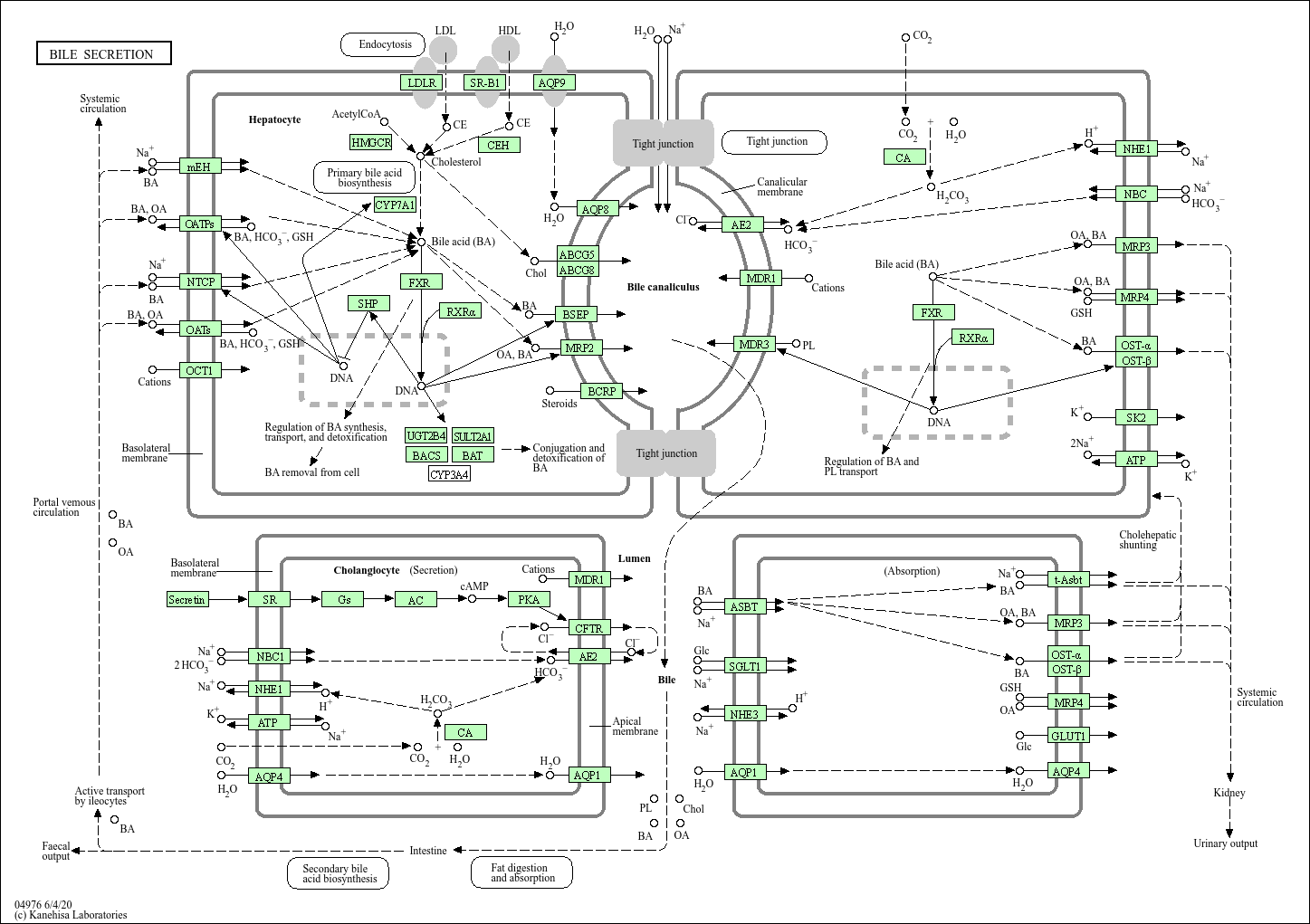 Bile is a vital secretion, essential for digestion and absorption of fats and fat-soluble vitamins in the small intestine. Moreover, bile is an important route of elimination for excess cholesterol and many waste product, bilirubin, drugs and toxic compounds. Bile secretion depends on the function of membrane transport systems in hepatocytes and cholangiocytes and on the structural and functional integrity of the biliary tree. The hepatocytes generate the so-called primary bile in their canaliculi. Cholangiocytes modify the canalicular bile by secretory and reabsorptive processes as bile passes through the bile ducts. The main solutes in bile are bile acids, which stimulate bile secretion osmotically, as well as facilitate the intestinal absorption of dietary lipids by their detergent properties. Bile acids are also important signalling molecules. Through the activation of nuclear receptors, they regulate their own synthesis and transport rates.