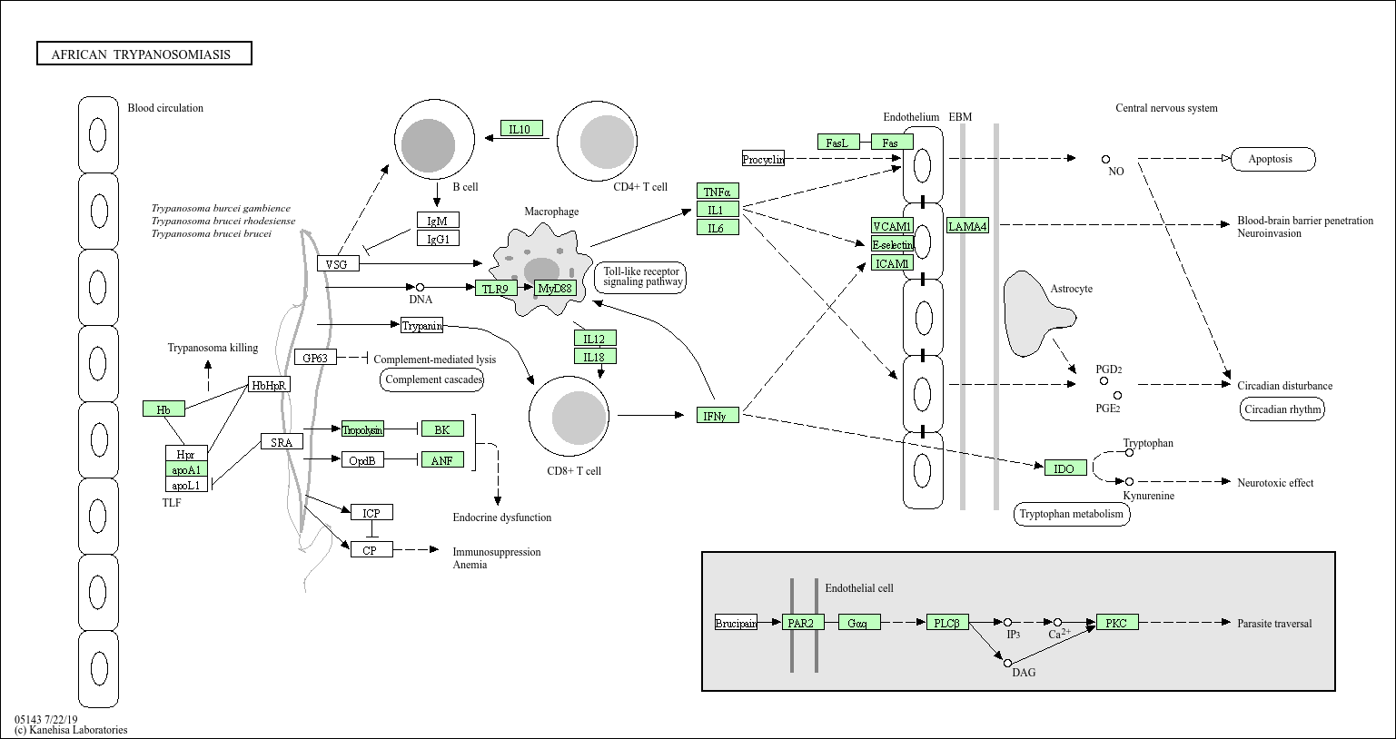 Trypanosoma brucei, the parasite responsible for African trypanosomiasis (sleeping sickness), are spread by the tsetse fly in sub-Saharan Africa. The parasites are able to pass through the blood-brain barrier and cause neurological damage by inducing cytokines like TNF alpha, IFN gamma, and IL1. These cytokines and other metabolites such as nitric oxide and somnogenic prostaglandin D2 disturb circadian rhythms in patients with African trypanosomiasis.