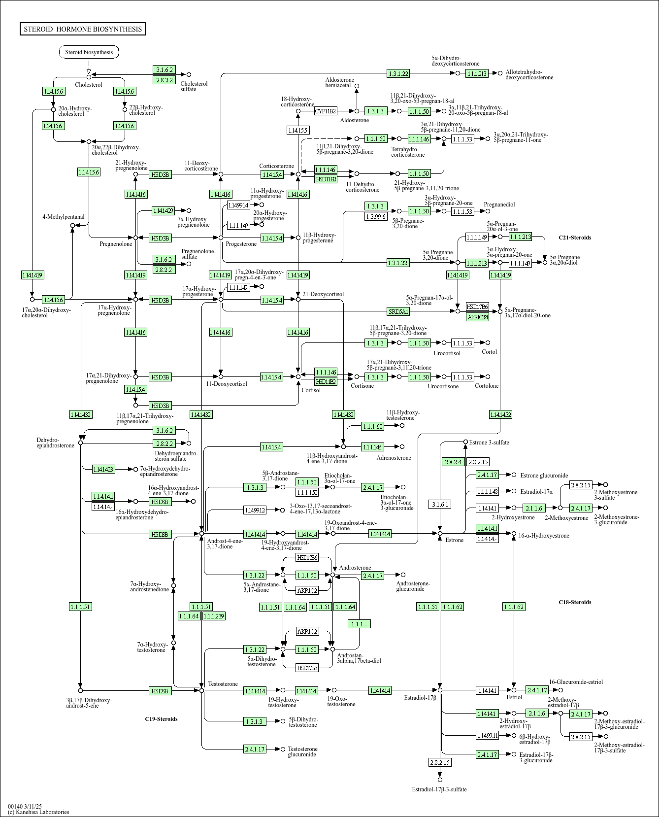 M00110]. The enzyme CYP17A1 is responsible for the 17,20 lyase and 17alpha-hydroxylase activities in respective pathways. (iii) Female hormones estrone and estradiol are formed from testosterone and 4-androstene-3,17-dione by oxidative removal of the C19 methyl group and subsequent aromatization of ring A. In addition to these three groups, recent studies show that there is another group, termed neurosteroids, synthesized in the brain rather than the peripheral endocrine gland.